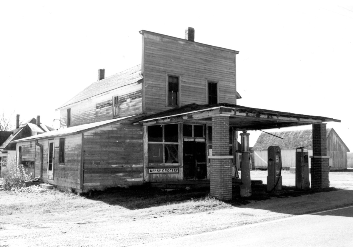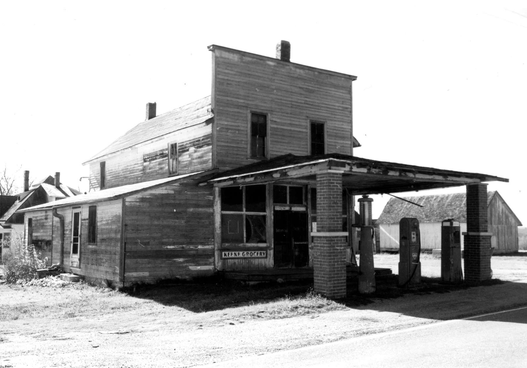 When this photo of the Keene Grocery was taken in the 1950s, the store had gas pumps very near the edge of K-4 Highway. By this time, the east addition to the store was just a one-story structure.