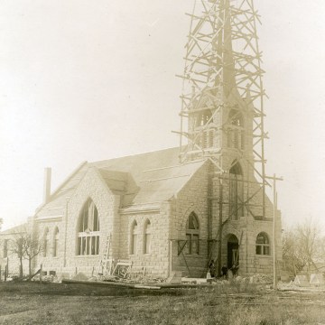 In this real photo postcard from 1908, the St. John Lutheran Church is seen under construction with scaffolding surrounding the steeple. Stonemasons had not yet installed the buildings spires along the roofline and the windows had not been installed when this view was taken. Photo courtesy St. John Lutheran Church.