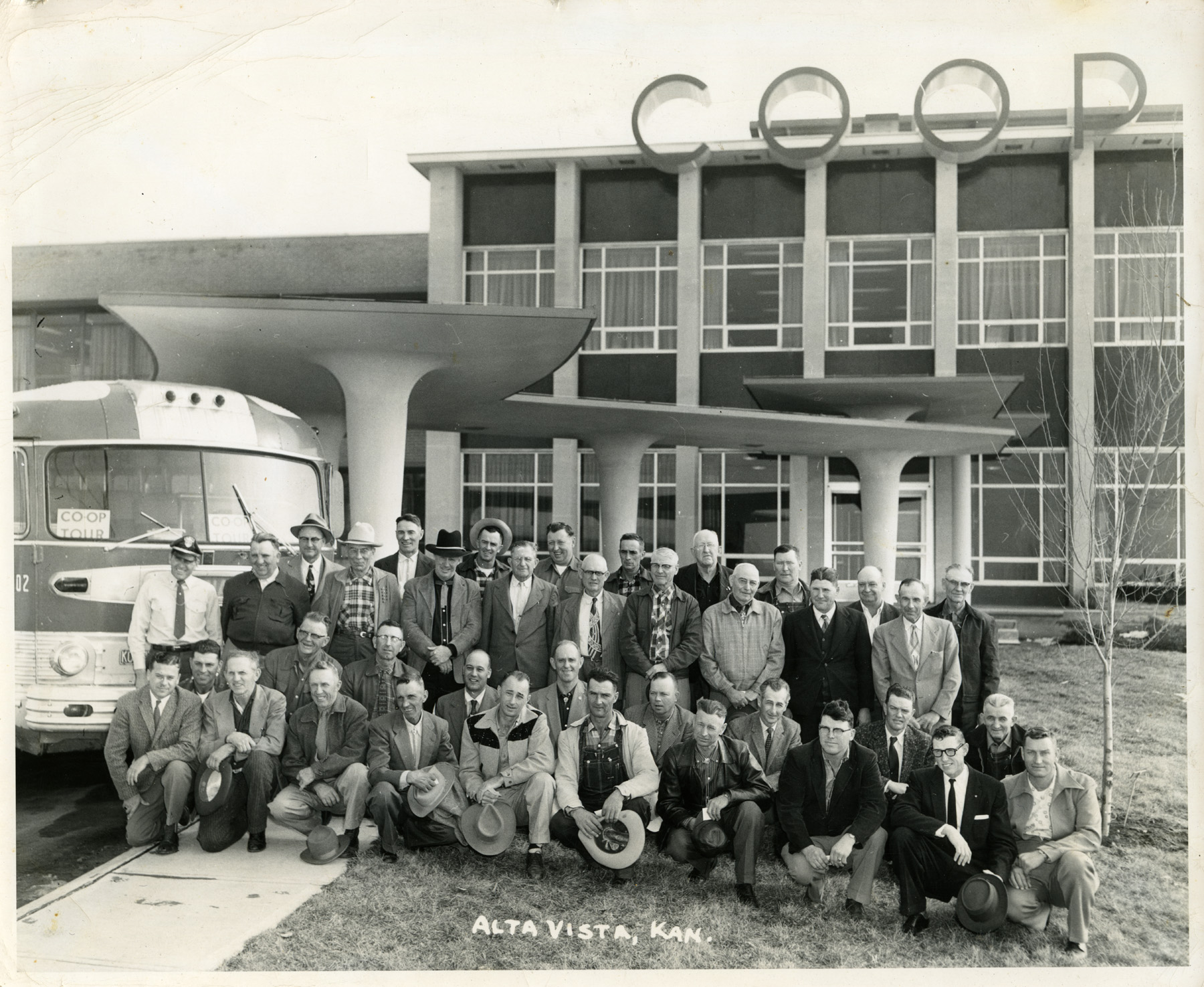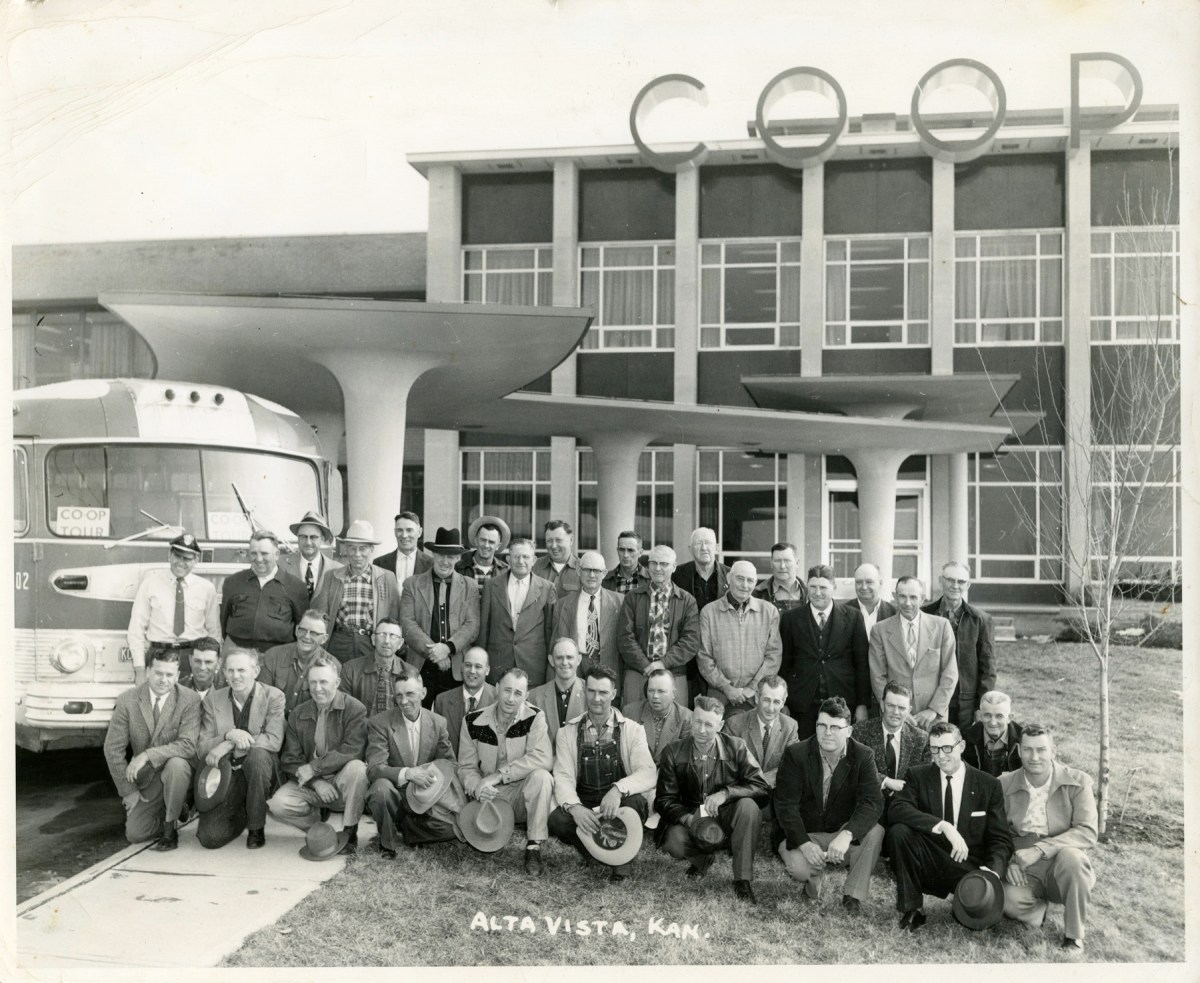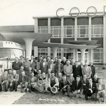 From the Bat Nelson Collection, this is a view of a group from the Alta Vista Coop on a trip to the Co-op Office Building in Kansas City, dated January 30, 1958. Front row, left to right: Vernon Zeckser, Oral Weeks, Homer Roberts, Walter Kraus, Vernon Richter, Clyde Thomas, Albert Meinhardt, Theodore Jones, Victor Zimmerman, and Virgil Bryant. Second row, left to right Aaron Unruh, Harlow Crowell, O.H. Swenson, George Eberle, Roy Carlton, Wayne Horne, Dale Fechner, Emmett Furney, and Walter Rutledge. Third row, left to right, Chas. Wrenn, Carl Ziegenhirt, Purley Horne, Bert Sisson, Arthur Kahle, T.W. Hodge, W.R. Zimmerman, Henry Andres, M.W. Andres, and Walter Swartz. Fourth row, left to right, Roy Reed, John Litke, Maurice Cashman Wallace Cripps, Dan Cashman, William Reineke, Benjamin Pape, C.E. Ensiminger, and Ed Newmeyer.