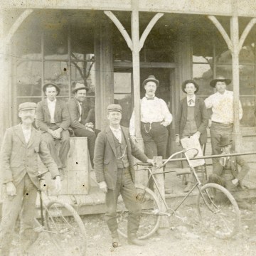 A group of men gather in front of the Bunger Hotel in Alta Vista, Kansas for this photo taken in 1908-1909. On the reverse of the photo, Alta Vista barber, Bat Nelson writes, “Man in center with arm around pole, Dr. William Smith. In 1909 the Bunger advertised in the High School annual, Board and Room $1.00 per day. Man number 3 helped dig basement for brick building that burned down, basement was dug in 1911.” No other individuals in the photo are identified.