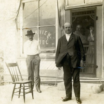 This view of the Fairview Hotel in Alta Vista, Kansas was taken by Alma photographer, Gus Meier on August 30, 1912. The Fairview, constructed in 1887, was among the first buildings constructed in the new town of Alta Vista, Kansas. Frank Dean is the man at the left wearing a hat, and the well-dressed gentleman in the black suit is William Jennings Bryan, three-time Democratic nominee for President of the United States.