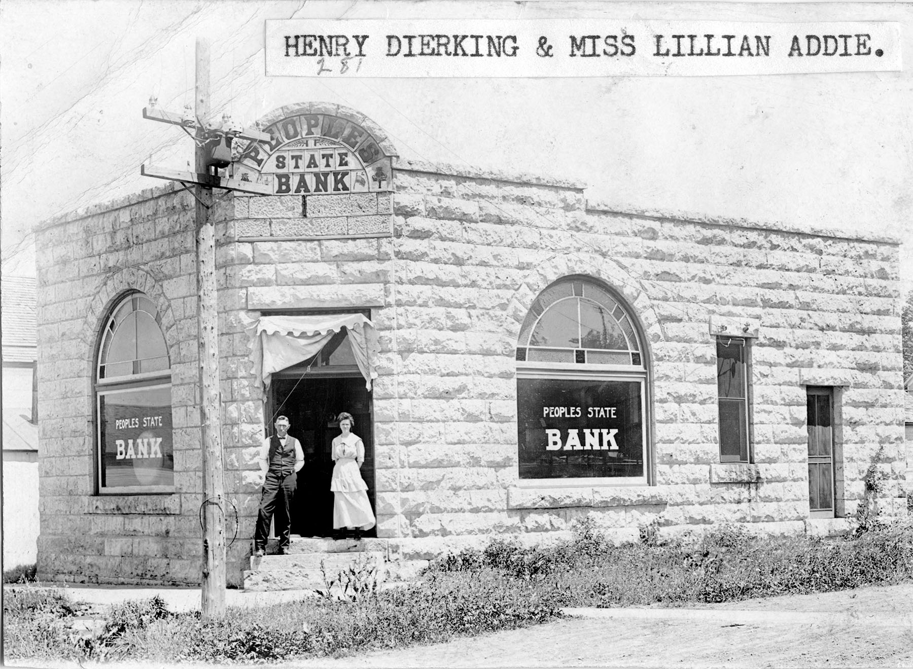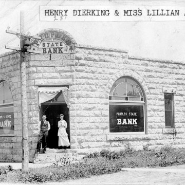 Henry Dierking and Miss Lillian Addie pose in the doorway of the People’s State Bank at Alta Vista in this real photo postcard, circa 1910. The bank was one of many which failed during the Great Depression of the 1930s.