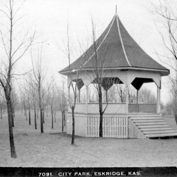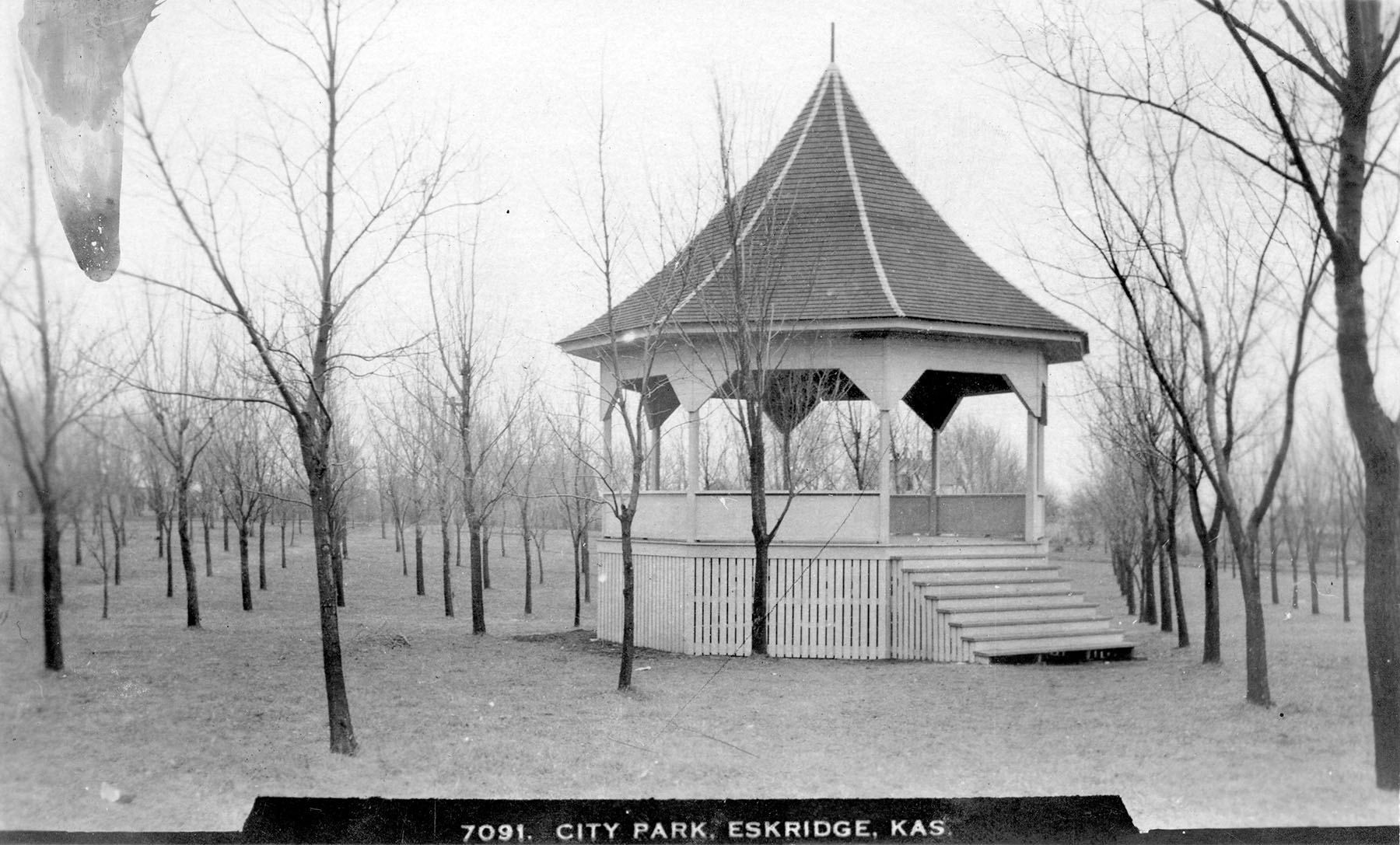 This real photo postcard view of the bandstand in the City Park at Eskridge, Kansas shows long rows of newly planted trees surrounding the gazebo. This view dates from about 1910. Photo courtesy Greg Hoots.