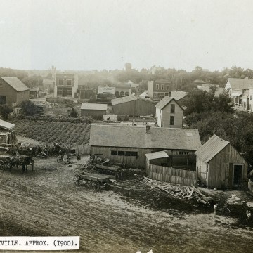This 1910s view of Harveyville shows the business district of the town in a bird’s-eye view of the town taken from atop the grain elevator.
