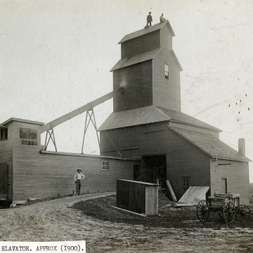This early 1900s view of the Harveyville grain elevator shows two men, Bill Boatwright and John Shrink on top of the elevator, while an unidentified man stands on the building’s driveway. The elevator was owned by the Garinger-Farrell Elevator Company and was demolished on February 4, 2008.