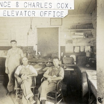 This interior view of the Harveyville grain elevator shows three men inside the elevator office. While the men are not individually identified, an attached caption indicates that Clarence and Charles Cox are two of them men.