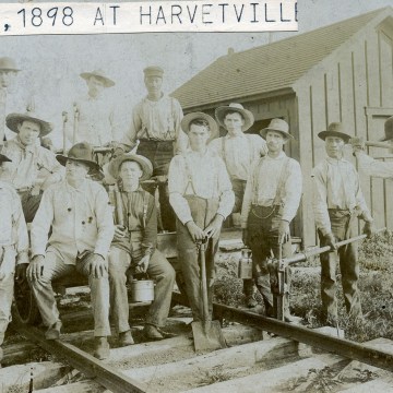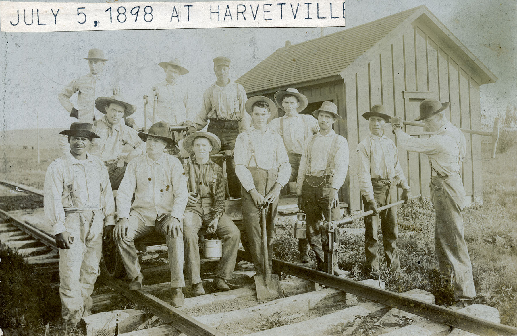 The Manhattan, Burlingame & Alma Railway was completed as far north as Alma and the first trains began to run on the line on July 5, 1880. This photo shows men driving the last spike at the Harveyville station, and has an attached caption that misidentifies the date as 1898.