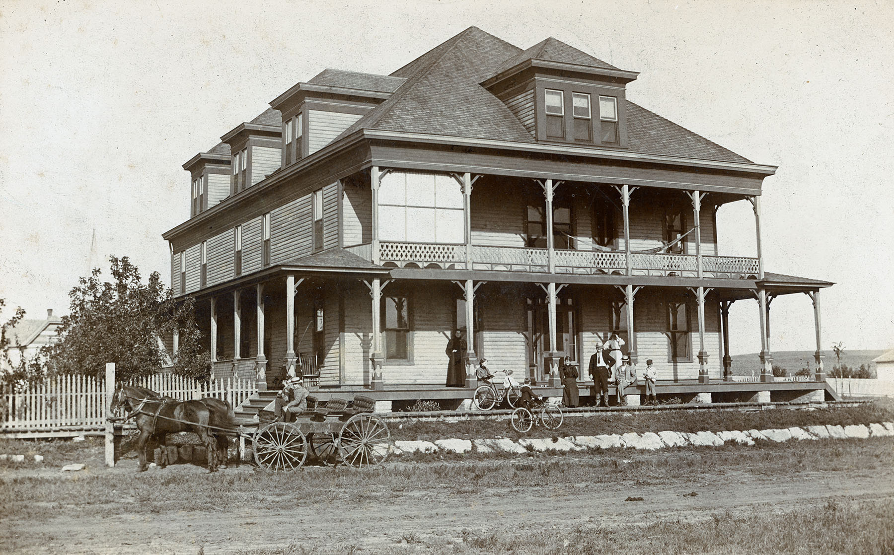 The Windler Hotel was built by W.B. Small in 1887 in Maple Hill, boasting the modern amenities of gas lighting and steam heat. This photo was produced by C.D. Small a professional photographer from North Topeka, Kansas.