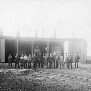The roundhouse gang poses in front of the McFarland, Kansas roundhouse in this Gus Meier photo from about 1910. With the discontinued use of steam locomotives, the roundhouse was demolished in 1953 and a diesel maintenance building constructed on the site. The new building was moved to Belleville, Kansas in 1955.