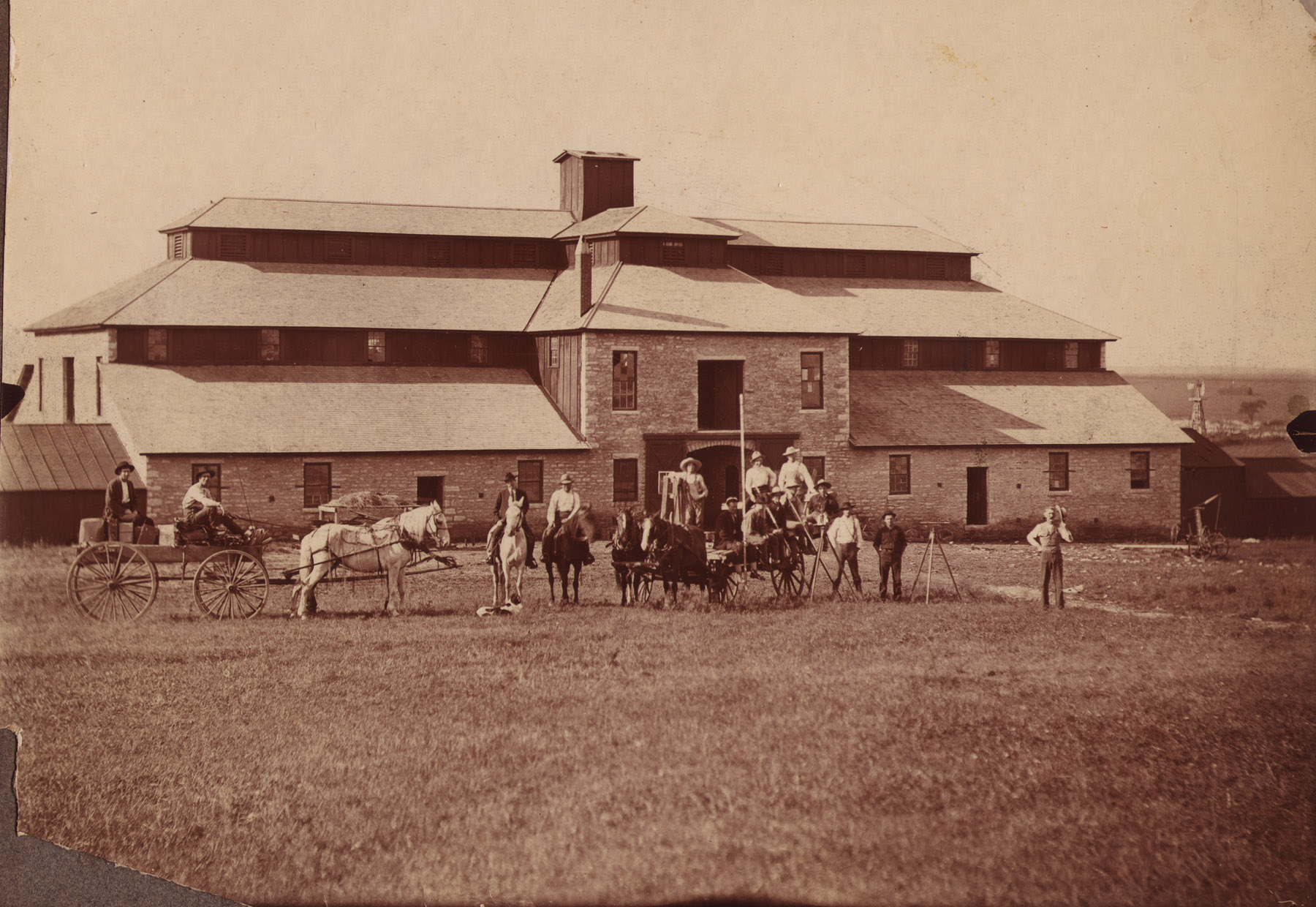 J.P. Wiser’s expansive cattle ranch, located in southern Wabaunsee County was managed by Wiser’s son, Harlow Wiser. In this view, from around 1900, a team of railroad surveyors are visible in the foreground. Notice that the windmill which sat atop the barn had been removed by this time. Photo Courtesy Ellen Coffman.