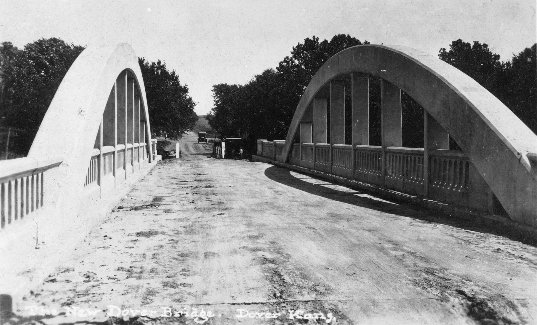 This real photo postcard view of the new concrete bridge at Dover, Kansas, looking east, was taken shortly after the bridge’s completion, circa 1924. Notice the small steel bridge just beyond the new bridge. Photo Courtesy Greg Hoots.