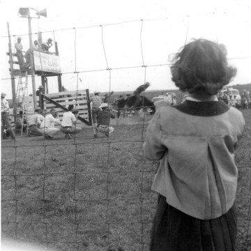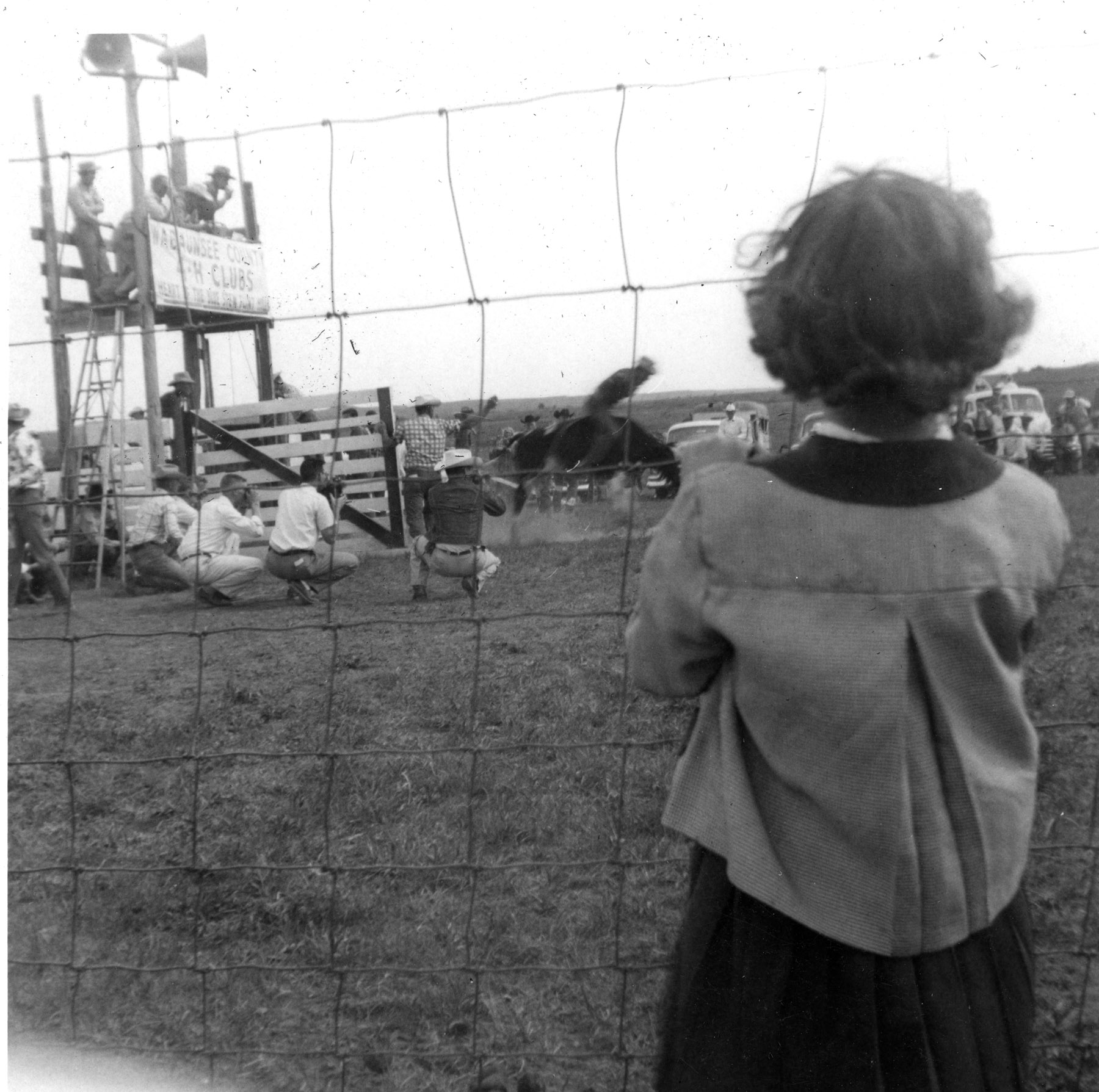 A young spectator watches a bronc rider at Lester Marten’s Rodeo Arena, located two miles south of Alma, Kansas. Marten built the arena to host 4-H rodeos, but soon it was used for weekly jackpot roping and rodeos. Photo Courtesy Julie Schultz.