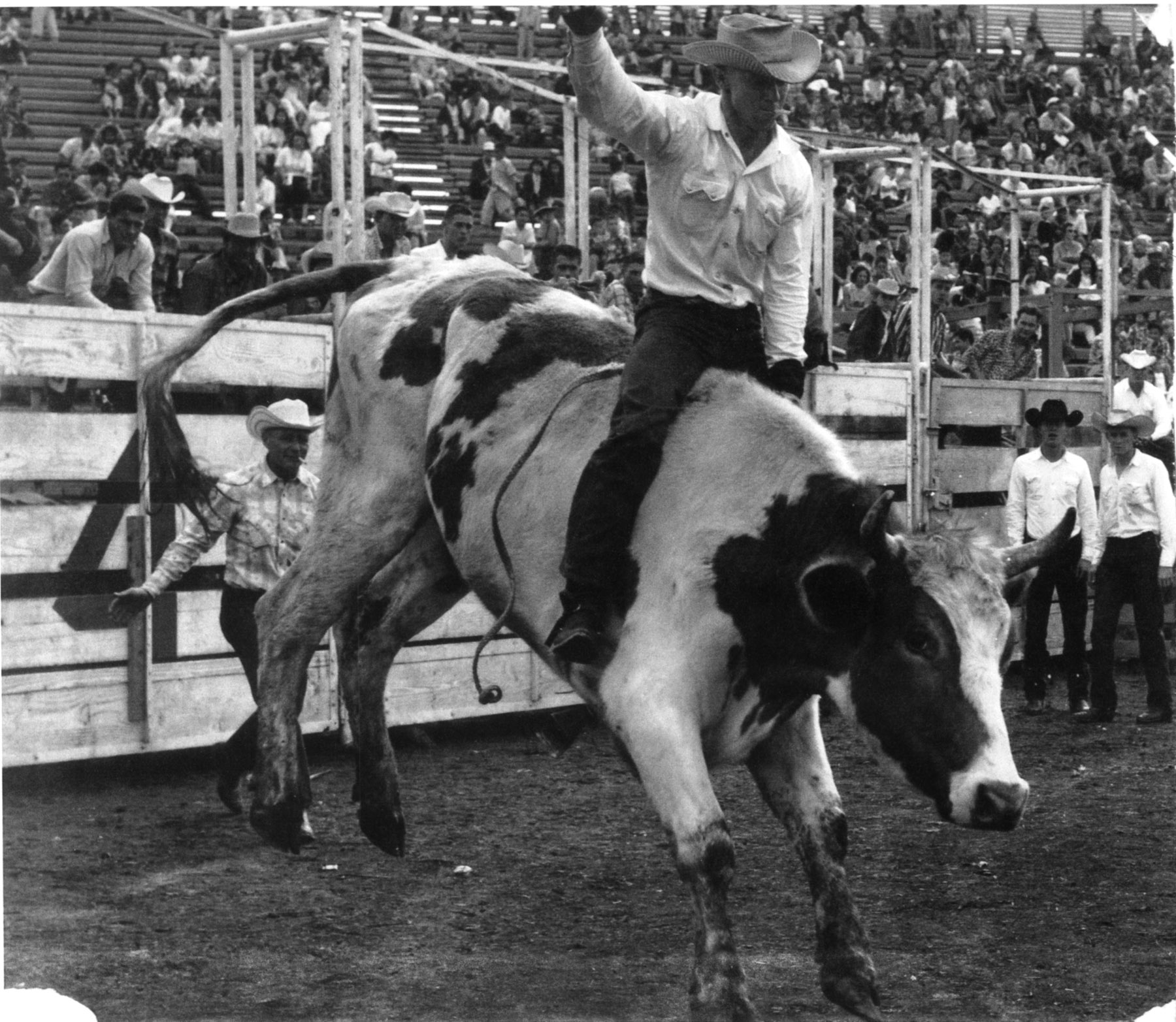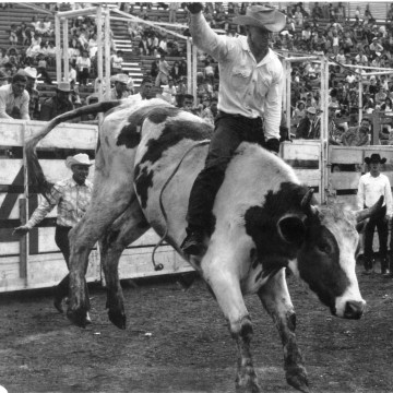 Cecil “Whitey” Butts, Alma, Kansas, competes here in the bull riding event at an unidentified 1959 rodeo. Butts traveled the rodeo circuit in the 1950s and 1960s competing in bronc riding, bull riding and other rodeo events. Photo courtesy Whitey Butts.