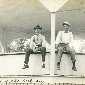 This real photo postcard, circa 1910 shows two men sitting on the railing of the bandstand, located in the City Park of Eskridge, Kansas. Handwritten at the bottom of the photo is “remains of the dirty six.”