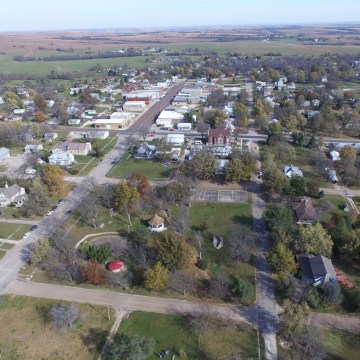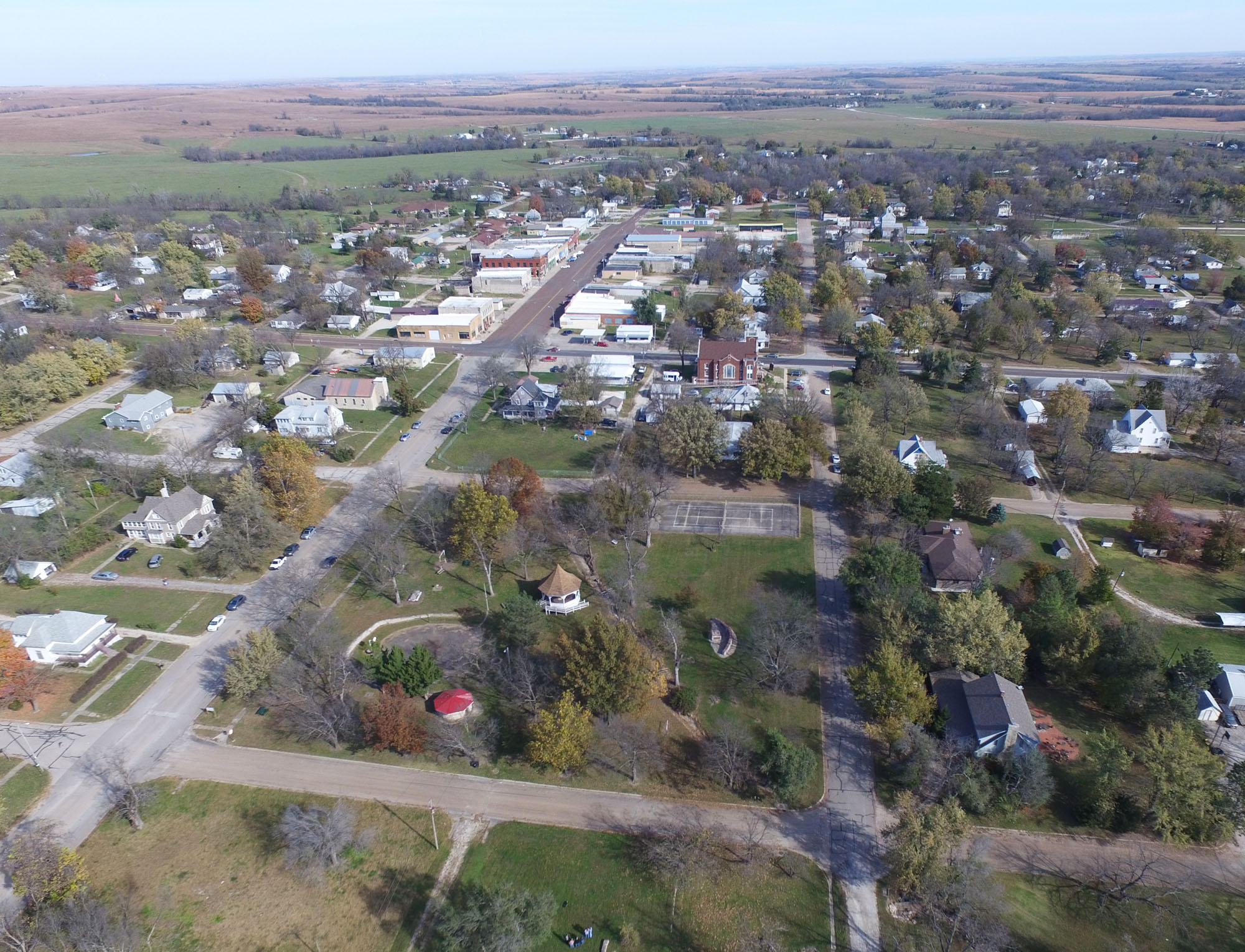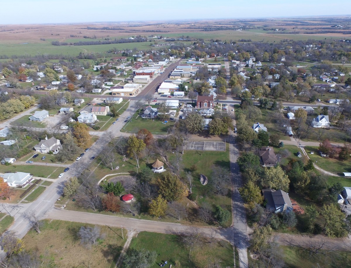 This aerial view of the City Park and the town of Eskridge, Kansas as created in October of 2016. The park is visible in the center foreground. Photo courtesy Tom Parish.