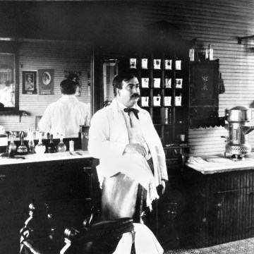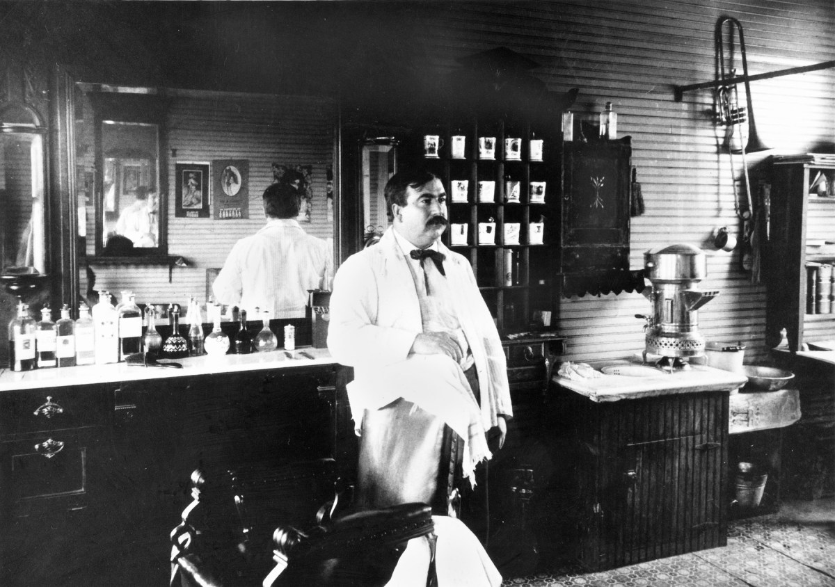 George Woody stands next to his barber chair at his shop in Paxico, Kansas in this view, circa 1905, by Alma photographer, Gus Meier. Photo courtesy Kansas State Historical Society, Kansasmemory.org.