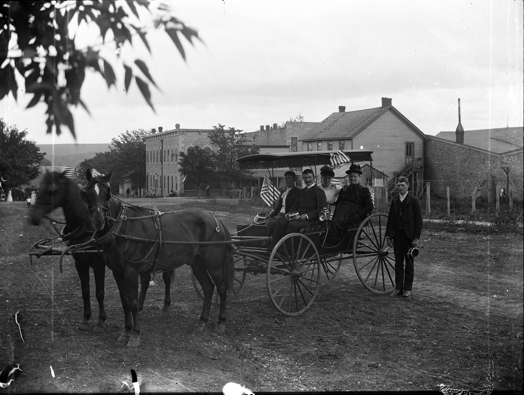 Two couples in a buggy and an unidentified man pose for Gus Meier on Main Street (West 3rd St.) in Alma, Kansas. Palenske Hall, 227 Missouri St., can be seen in the background and the back side of the first Wabaunsee County Courthouse is visible directly behind the buggy. Photo courtesy Paul Gronquist.