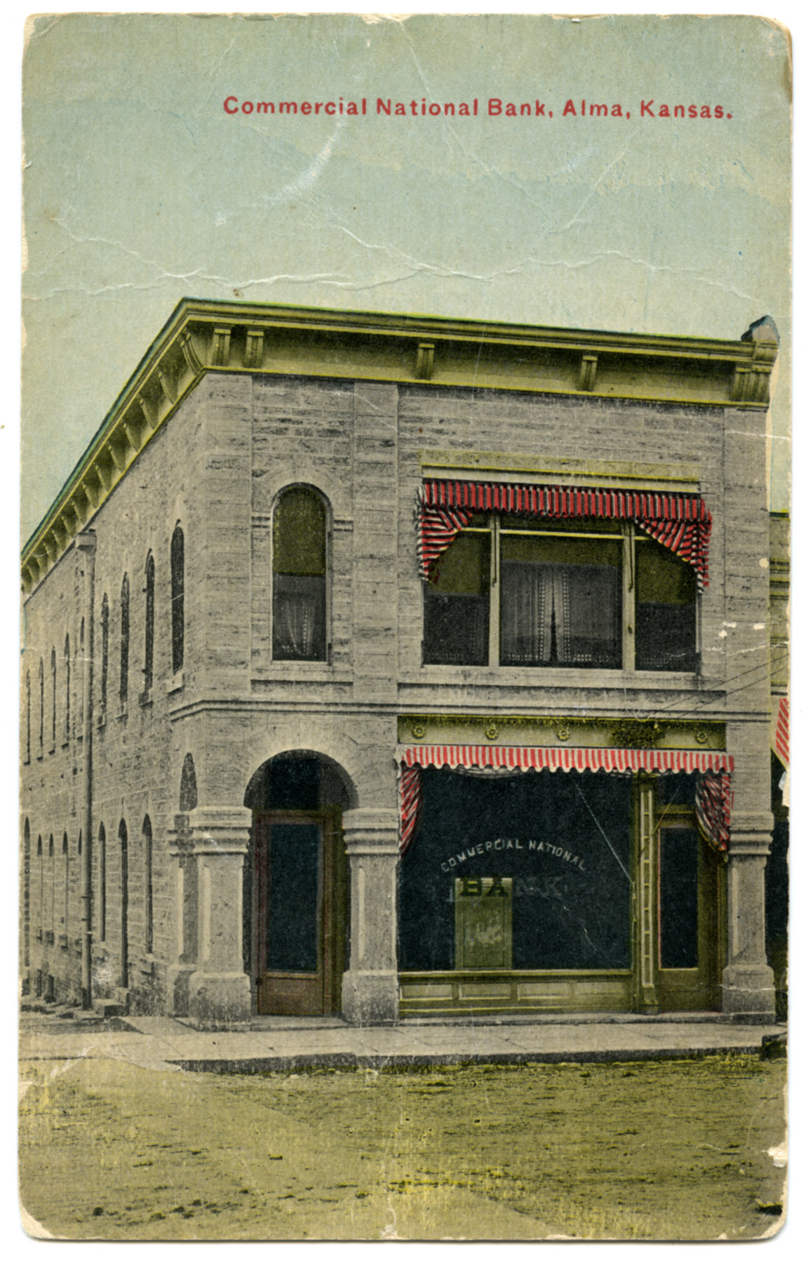 This is a colorized photo postcard showing the Commercial National Bank in Alma, Kansas. This building, a former saloon, was purchased by Louis Palenske in 1907 and the façade was extensively remodeled to accommodate the new bank.