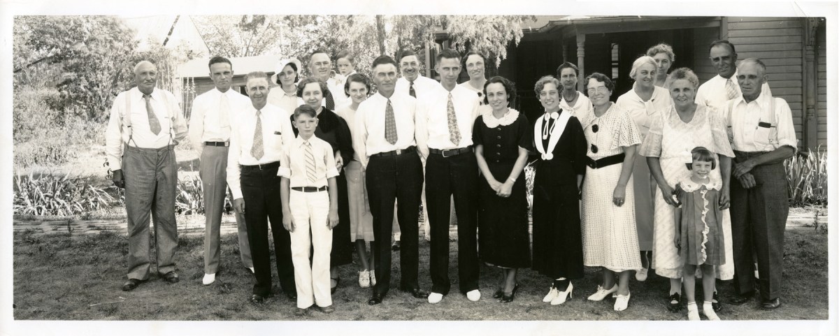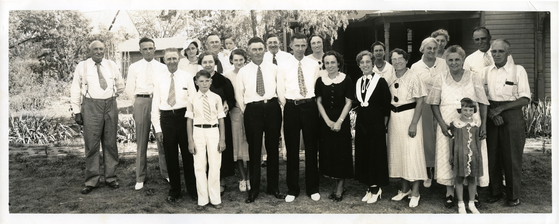 Gus Meier photographed the Palenske-Hallgren wedding party at Alma in 1935. Louis Palenske stands at the far right with Emma Palenske to his right, holding granddaughter Rita Stella Faulders’ arms. Earl and Florence Hallgren stand at the center of the group.