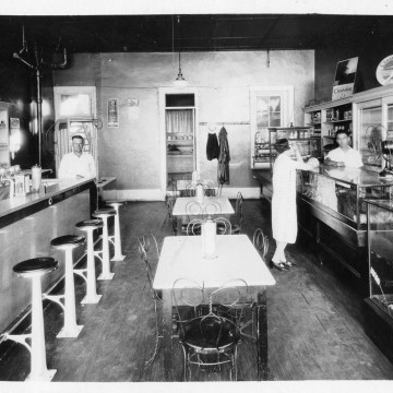 This interior view of an Alma, Kansas soda shop dates from the late 1930s.