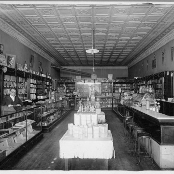 Preston Dunn, left, is seen in this interior view of his Rexall drug store in Eskridge, Kansas, circa, 1940. Photo courtesy Dean Dunn.