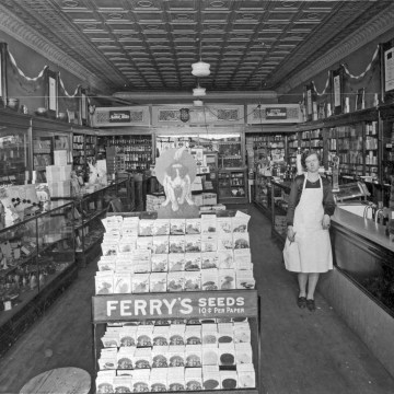 An unidentified employee stands beside the soda fountain inside Preston Dunn’s Rexall Drug Store in Eskridge, Kansas, circa 1935. Photo courtesy Dean Dunn.
