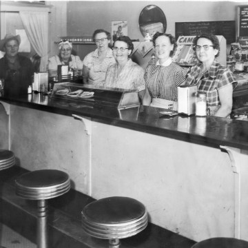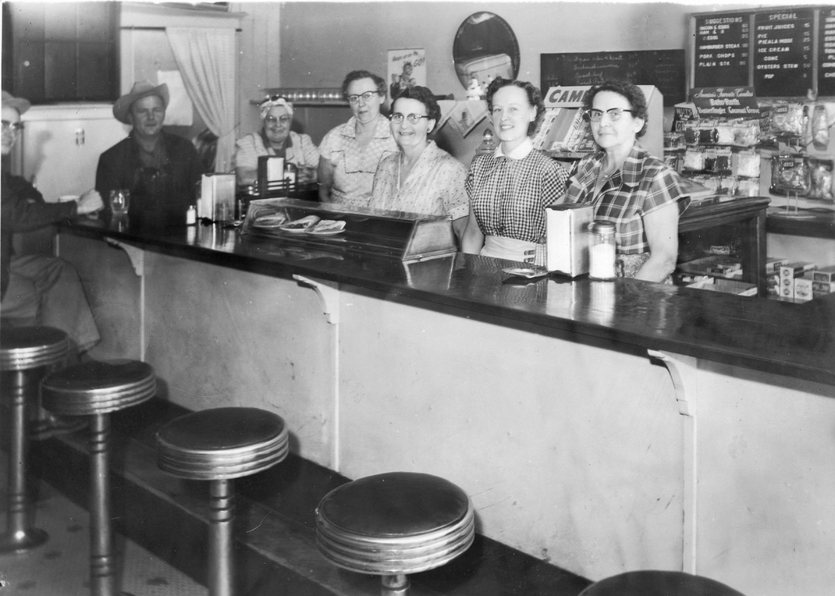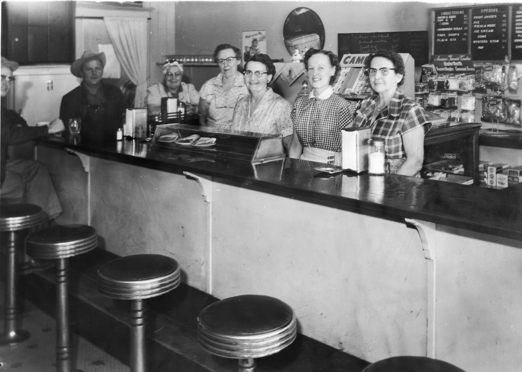 The staff of the Harvey House Café in Alma, Kansas pose behind the lunch counter. From left, in cowboy hat, owner, Melvin Zeckser, Naomi Mulford, Selma Miller, Ellen Herren, Evelyn Zeckser, and Helen Sommer