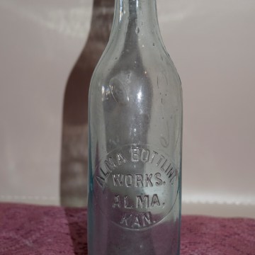 This crown-top pop bottle from the Alma Bottling Works, Alma, Kansas is on display at the Wabaunsee County Historical Society Museum in Alma, Kansas.