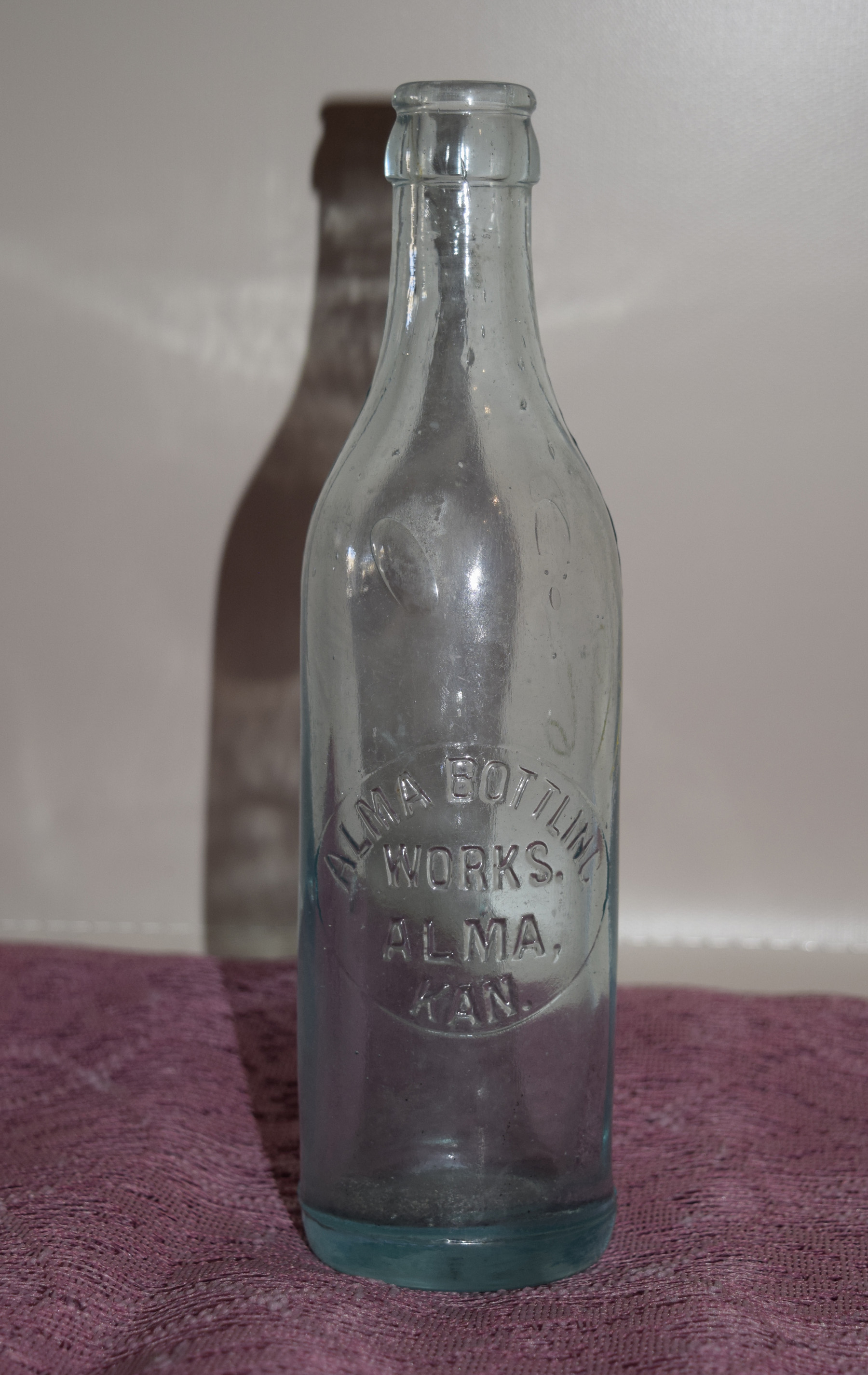 This crown-top pop bottle from the Alma Bottling Works, Alma, Kansas is on display at the Wabaunsee County Historical Society Museum in Alma, Kansas.