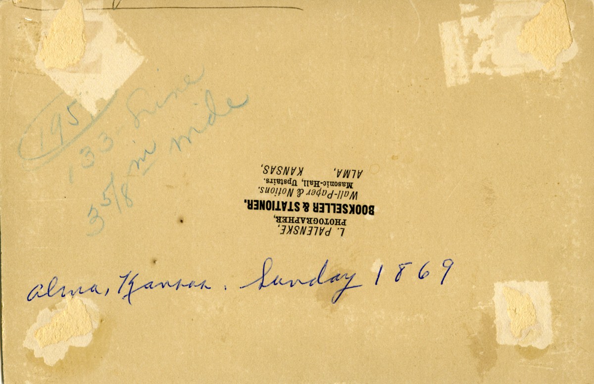 The reverse of the photo bears the stamp of L. Palenske, Photographer, Bookseller & Stationer, Alma, Kansas.