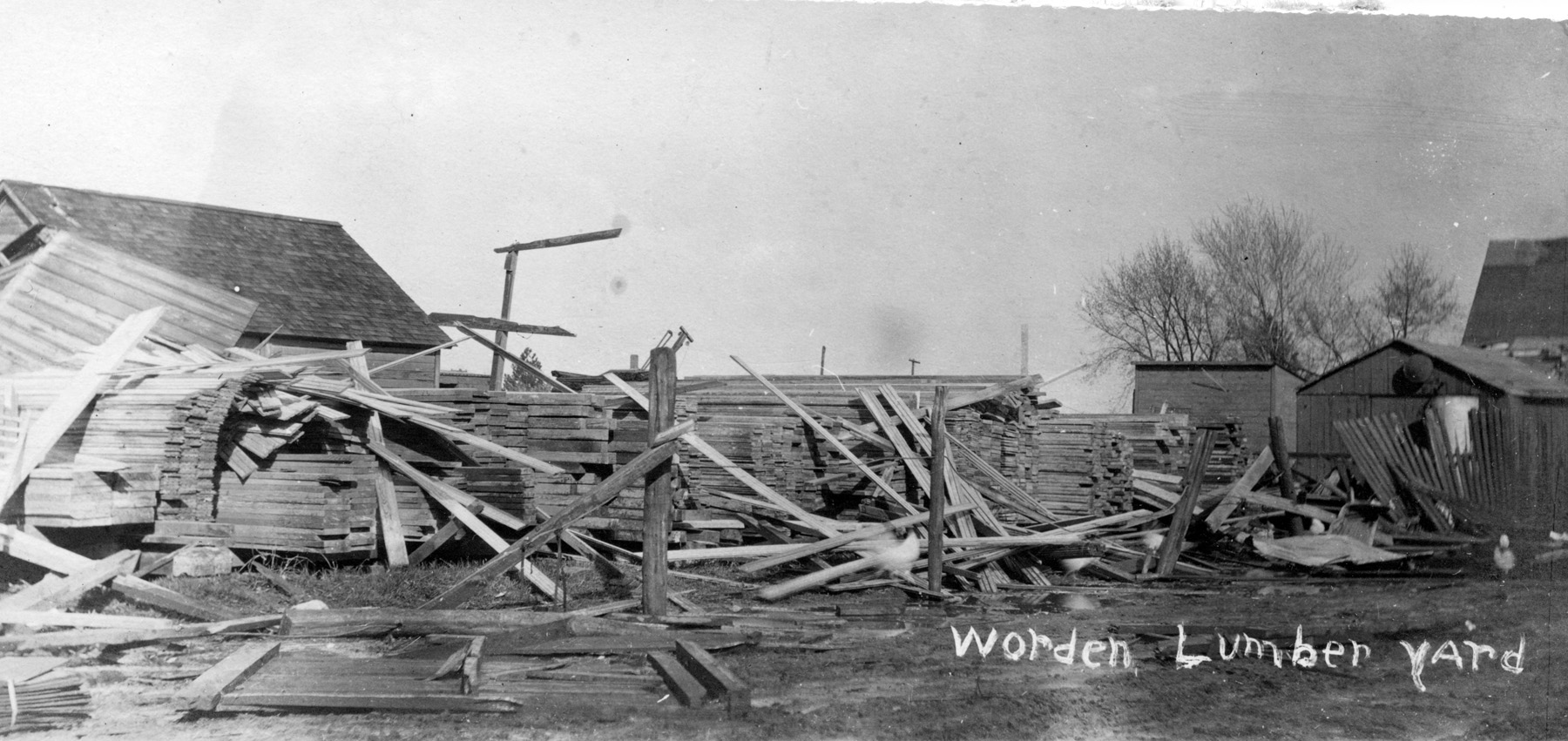 The Worden Lumber Yard was demolished by the April 12, 1911 tornado which struck Eskridge, Kansas. This photo was one of a series of photos of the storm damage by Easter Studio, Eskridge, Kansas.