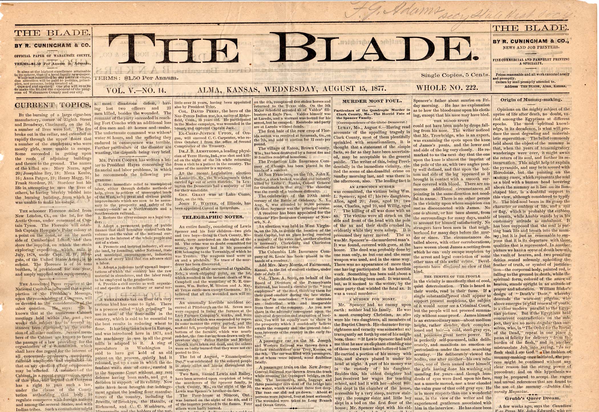 The Blade operated in Alma, Kansas for eleven months between March of 1877 to February of 1878.