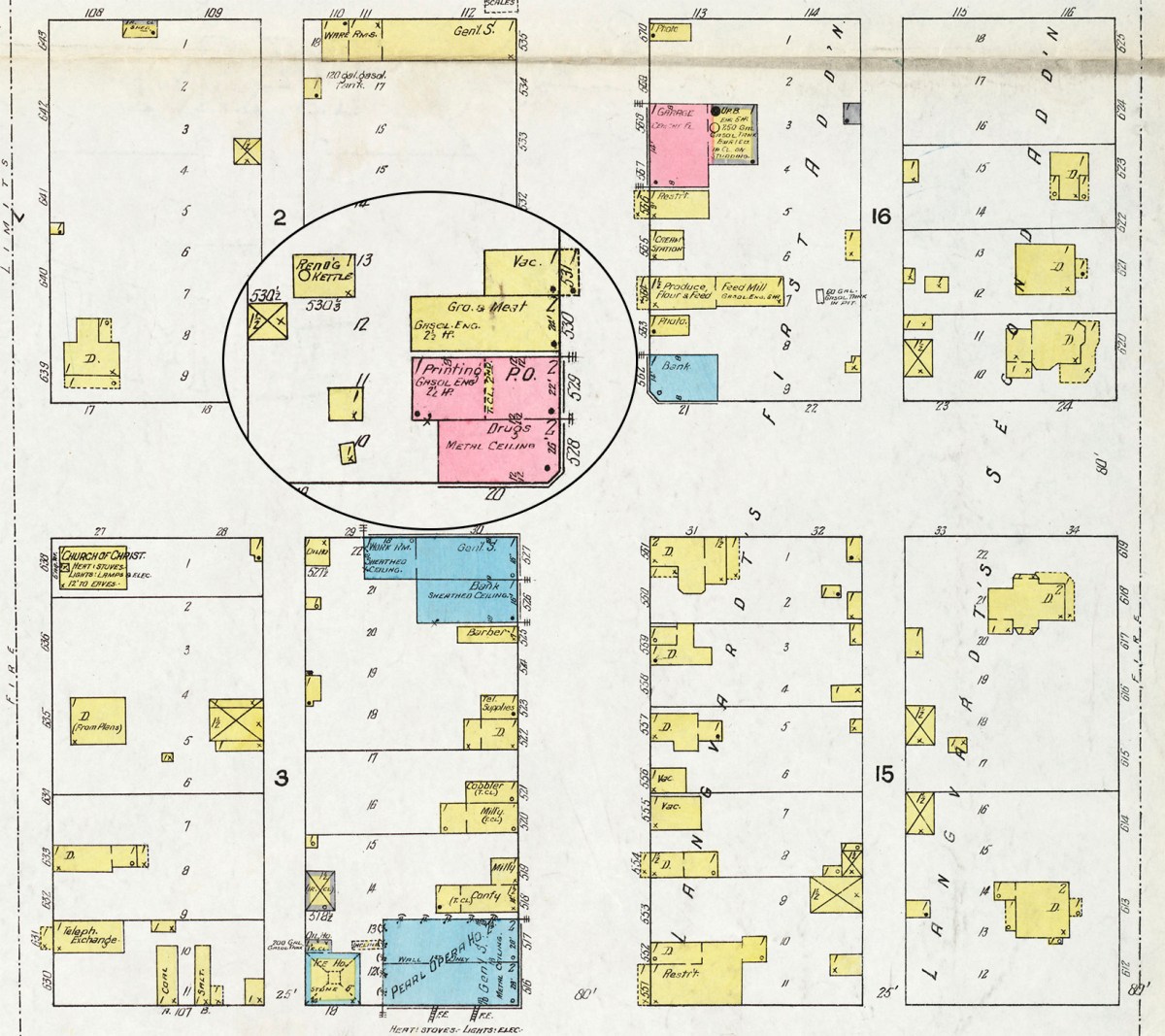This section of the Sanborn map for Alta Vista shows an enlarged section of four businesses located on Main Street. The northern-most building, marked vacant when this map was created in June of 1912, was the building where Anthony King opened his restaurant in August of that year.