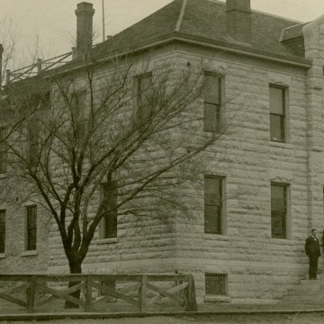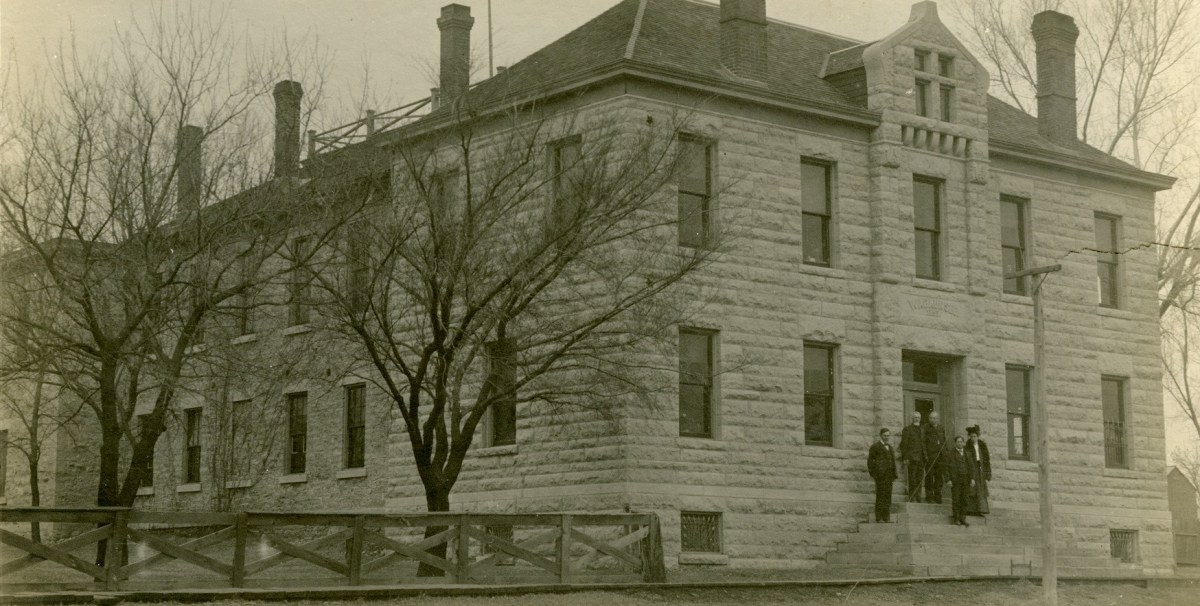 A group of county officials stand on the front steps of the Wabaunsee County Courthouse in this real photo postcard view, circa 1910. The Mullins and Roberts trials were both held in this courthouse.