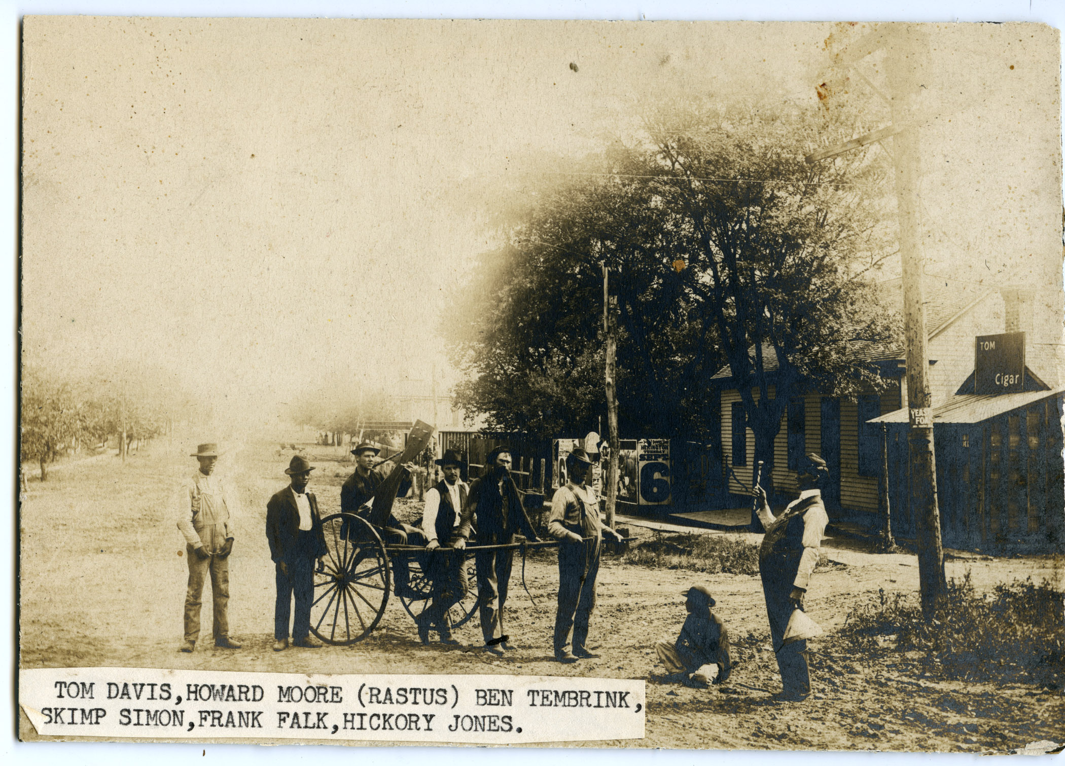 A group of Alma men pose for Gus Meier’s camera in front of Froshien Hall, a saloon located on East 3rd Street in Alma. The small building at the far right was a one-lane bowling alley, while Joker Horne’s “joint” was located in the second building.