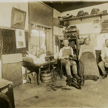 Ferdinand Herrmann, Christine Herrmann, and Fred Herrmann are seen in this Gus Meier interior view of their shoe shop in Alma, dated 1912.