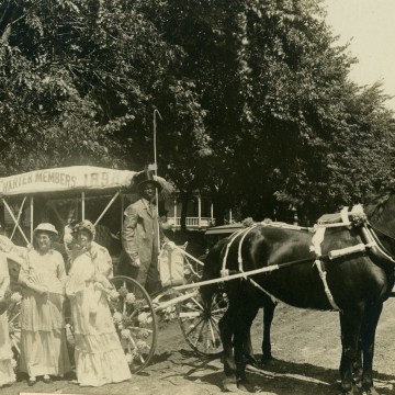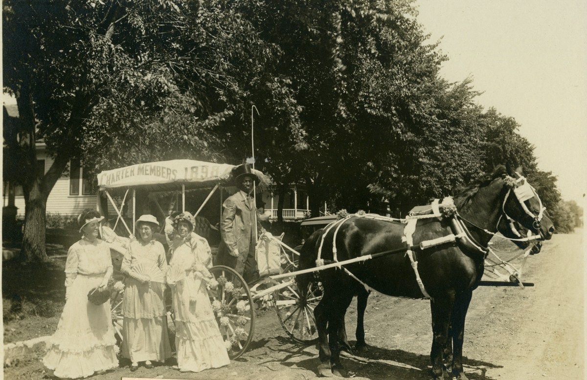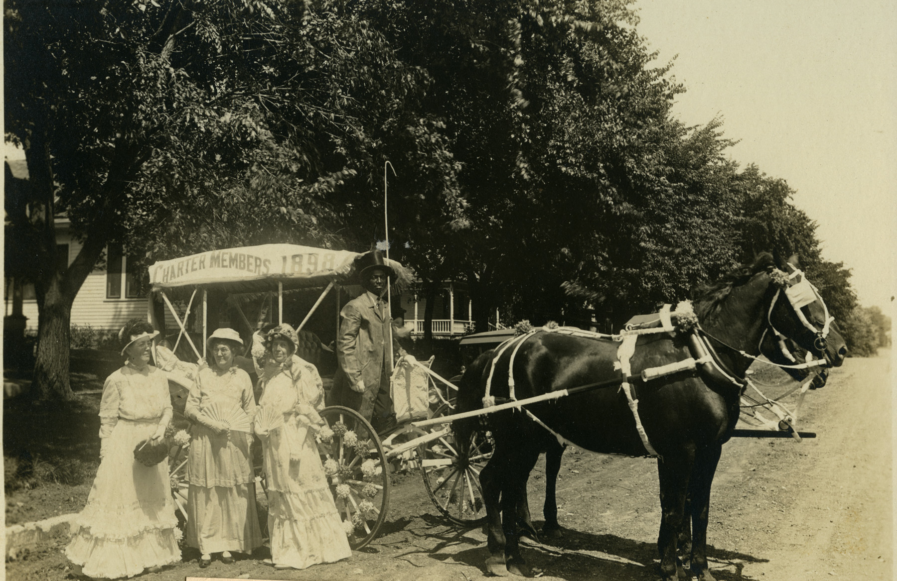Three Alma women, Marion Ross Palenske, Mrs. W. G. Weaver, and Mrs. Jerry Fields, charter members of the Royal Neighbors of American organization, pose with their driver, Leslie Gardenhire and a parade carriage in this view dated August 11, 1928.