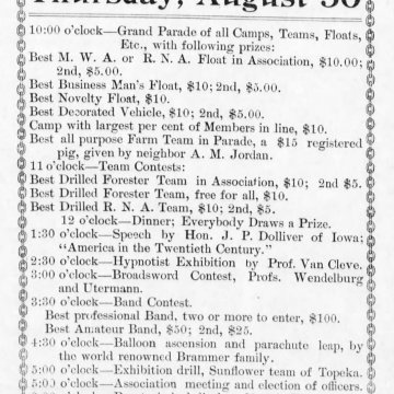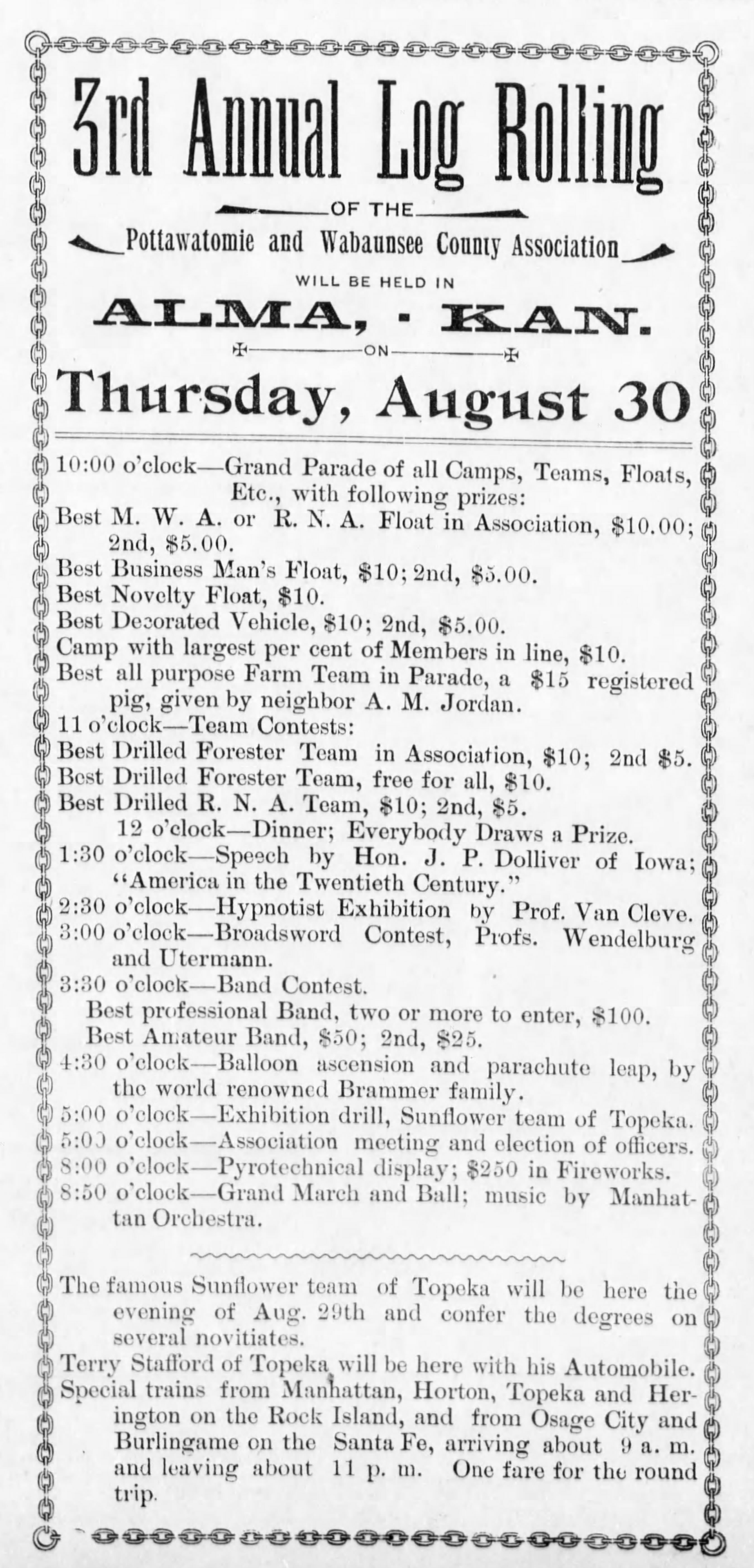 The Alma camp of the Modern Woodmen of America advertised the August 30th Log Rolling in The Alma Enterprise dated August 24, 1900.