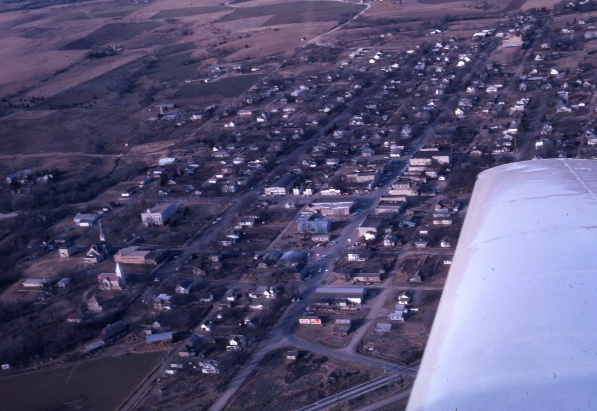 Charles Herman photographed several Wabaunsee County towns from the air in the 1960s. In this view of Alma, one can notice several differences from today. At the bottom of the photo, notice that Flint Hills Foods/Hormel had yet to be constructed. At the top left of the image notice that there was neither a city shop nor a water town on the hilltop. Notice that the Co-op grain elevators and the Hafenstine Construction building had yet to be built. The residential subdivision in the 400 block of West 8th Street was a field when this view was taken.