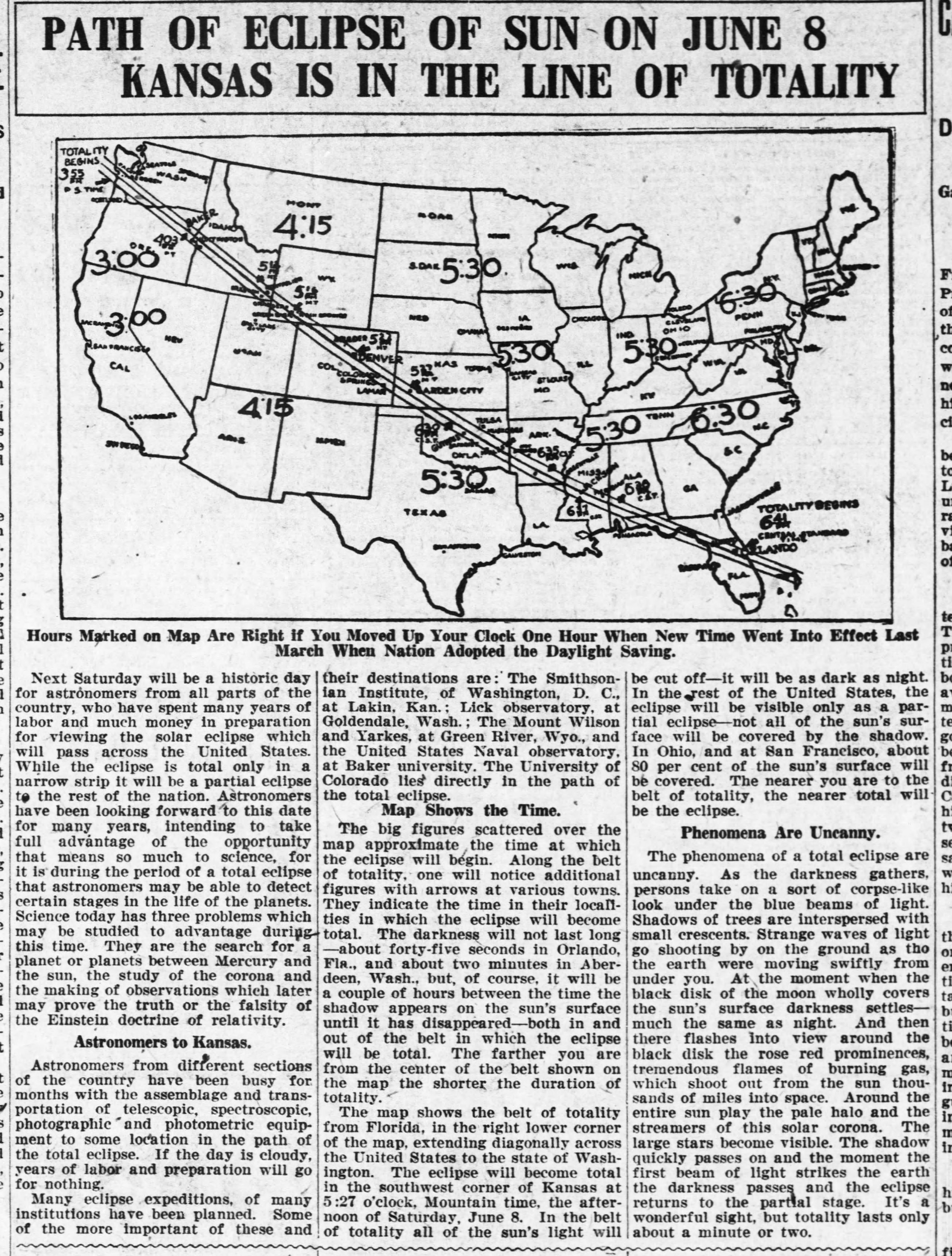 The Topeka Daily Capital newspaper of June 2, 1918 reported on the upcoming June 8, 1918 total eclipse of the sun.