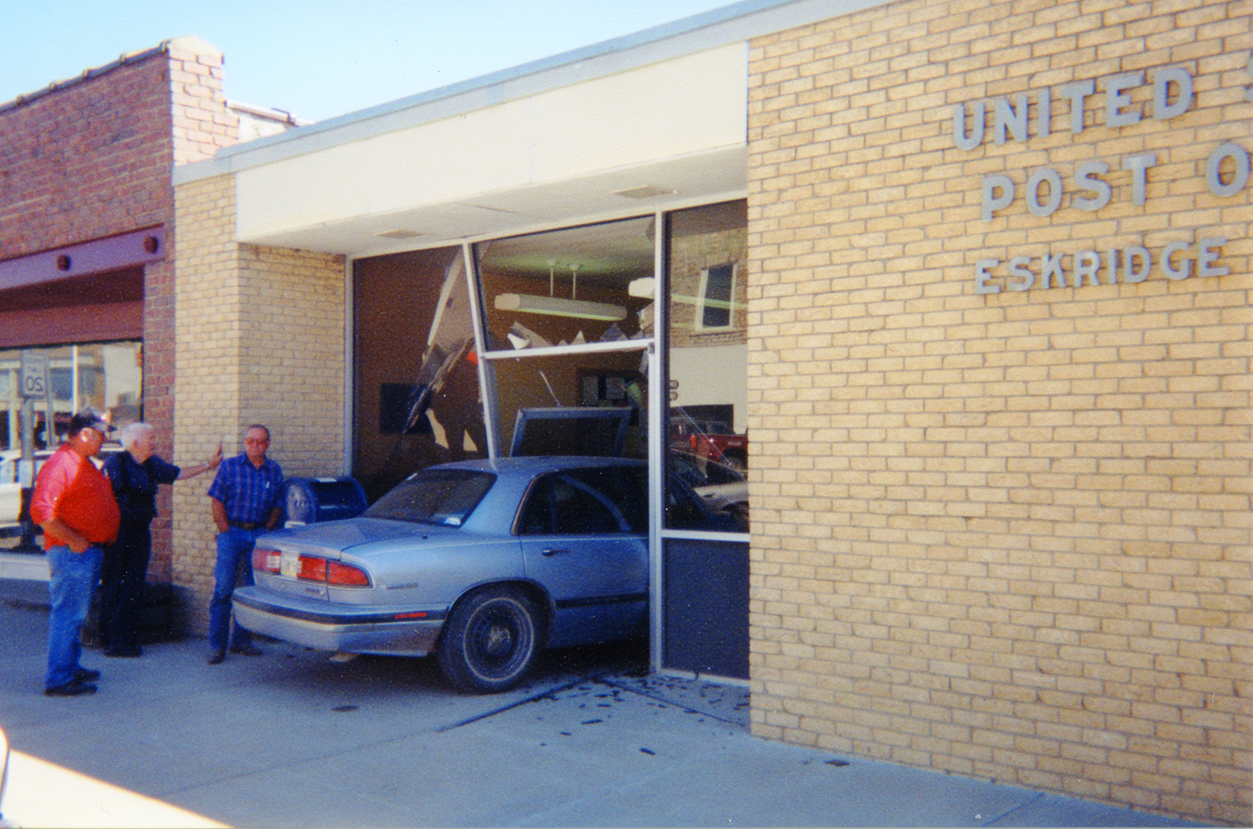 Bill Mercer, Dean Dunn, and Jack Price inspect the wreckage created when a customer of the Eskridge Post Office installed a drive-through window in the office in this view from about 2000.