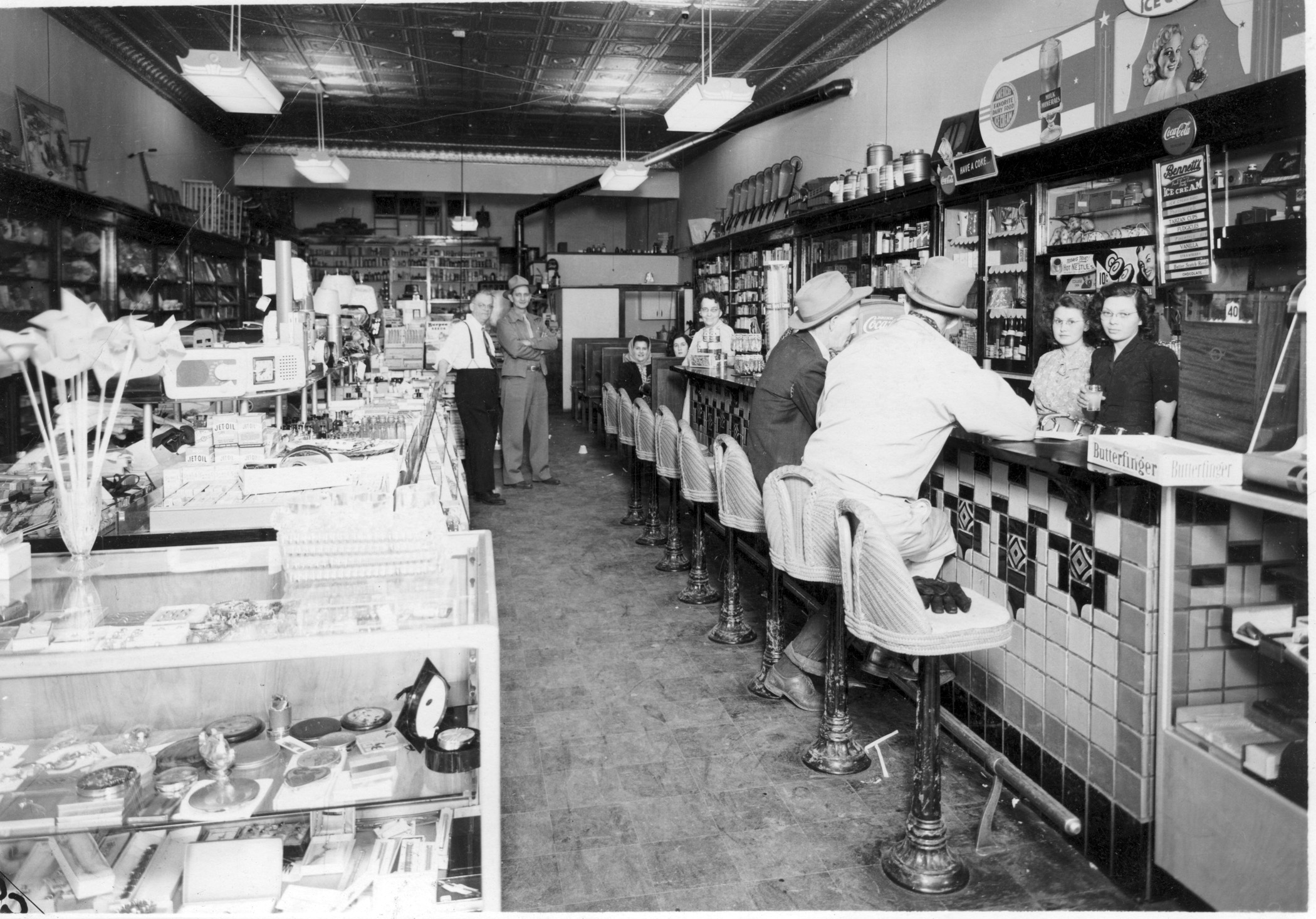 Preston Dunn stands at the left at the far end of the new soda fountain in his Rexall Drug Store located at 111 South Main Street in Eskridge, Kansas in this 1950s view.