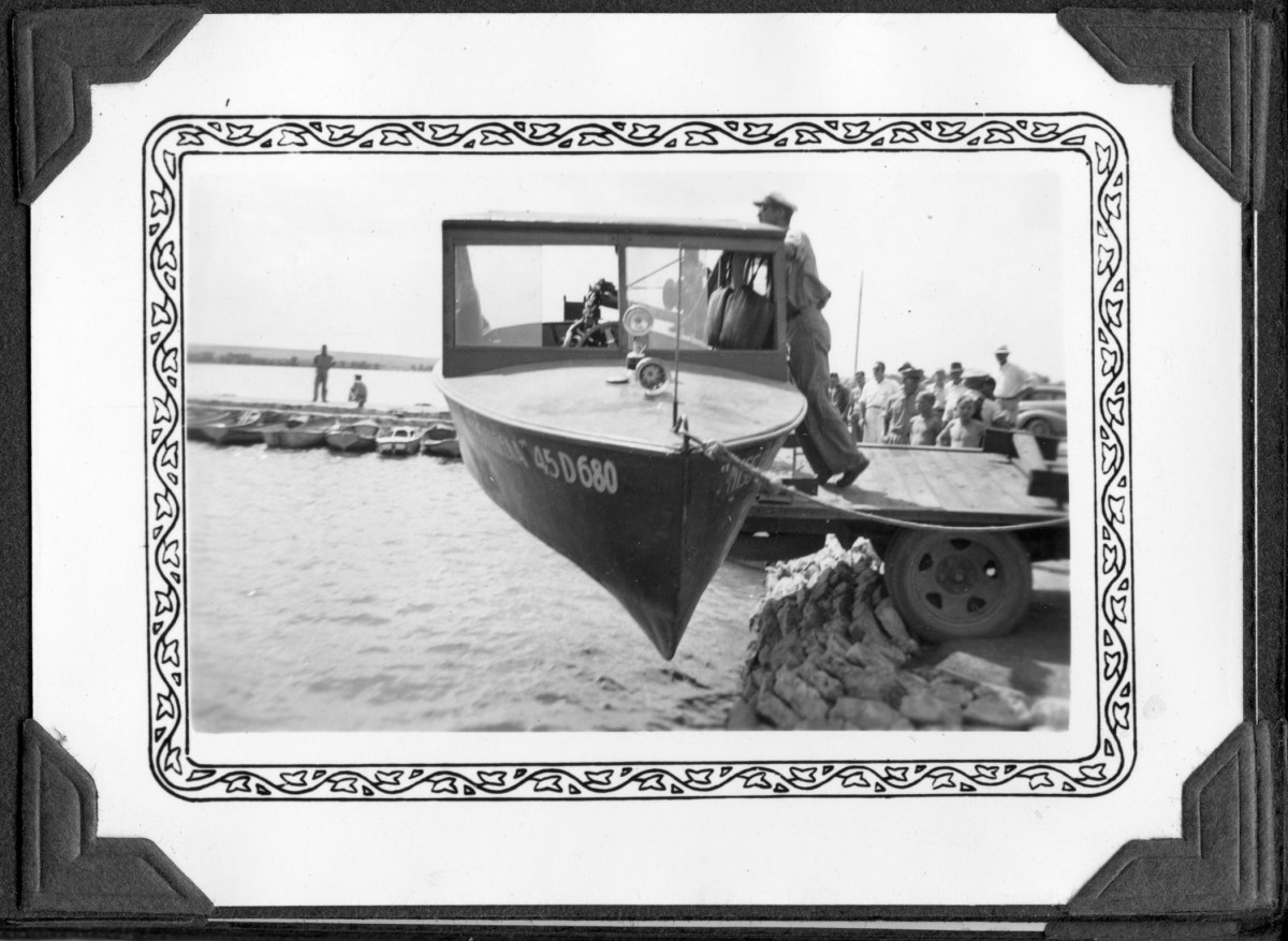 Dean Dunn photographed a boat being launched at Lake Wabaunsee in this view, circa 1940.