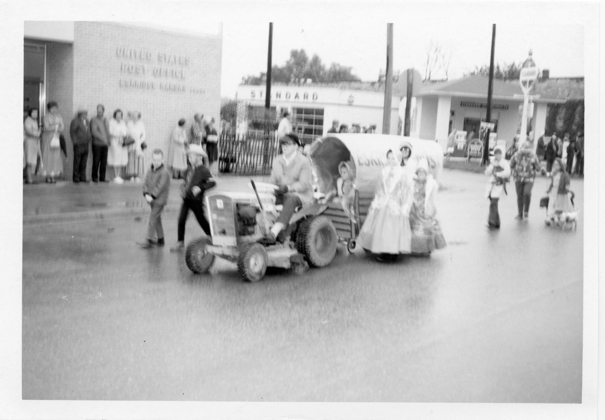 A group of Eskridge children brave a rainy day to join a fall parade at Eskridge in this view from about 1963. Virgil Wall’s Standard station is visible in the background.