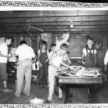 A group of Eskridge boy scouts prepare to enjoy a freshly cut watermelon at a scout meeting.