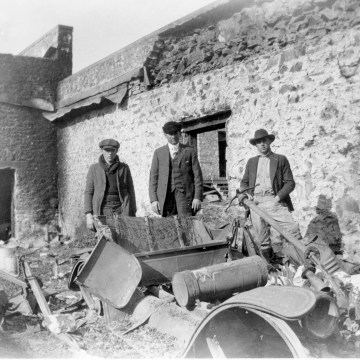 Three unidentified men stand amid the burned-out wreckage of autos at R. C. Day’s Ford dealership in this photo taken on February 4, 1921.