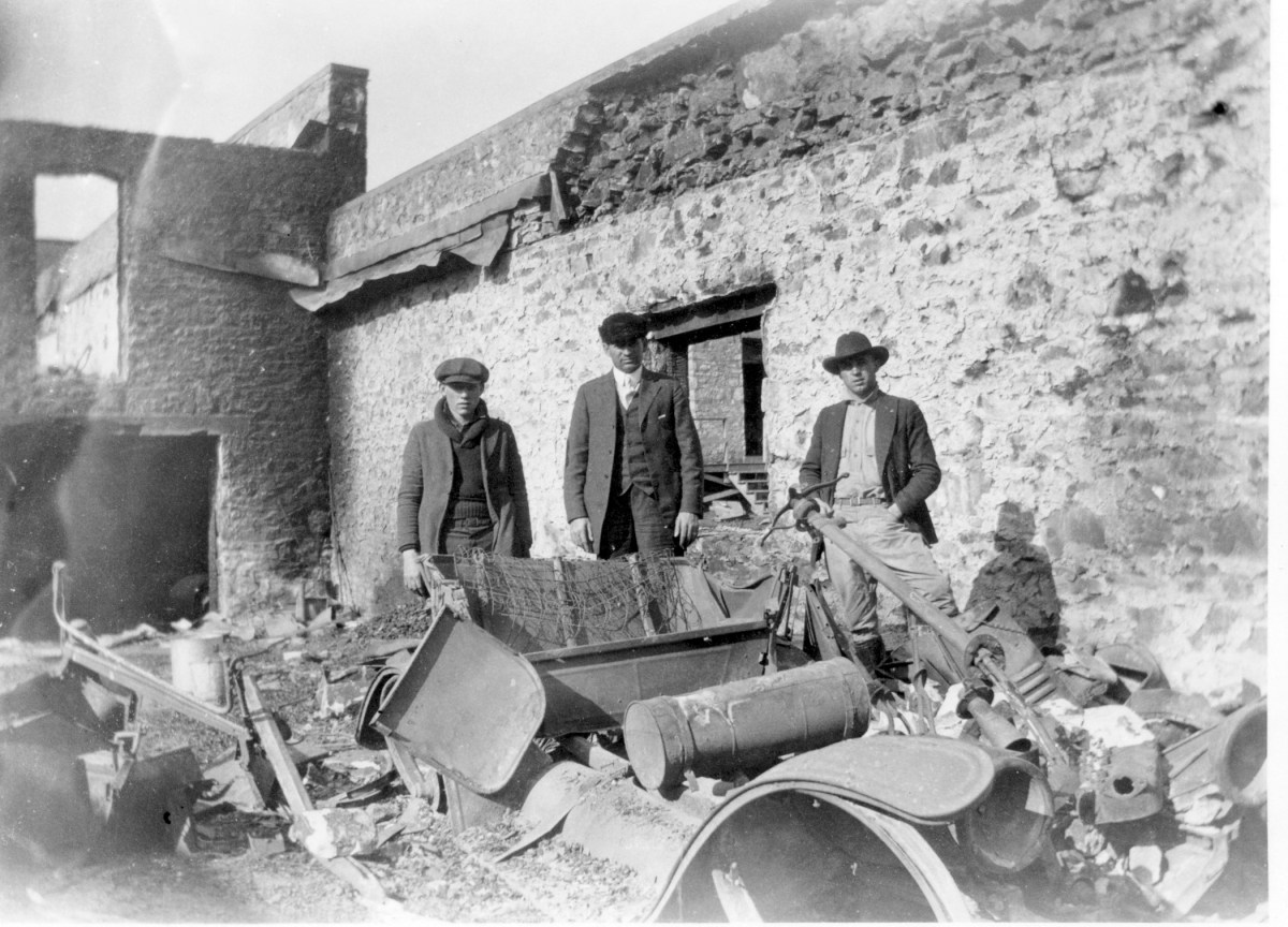 Three unidentified men stand amid the burned-out wreckage of autos at R. C. Day’s Ford dealership in this photo taken on February 4, 1921.