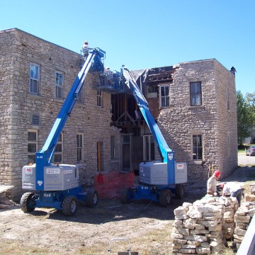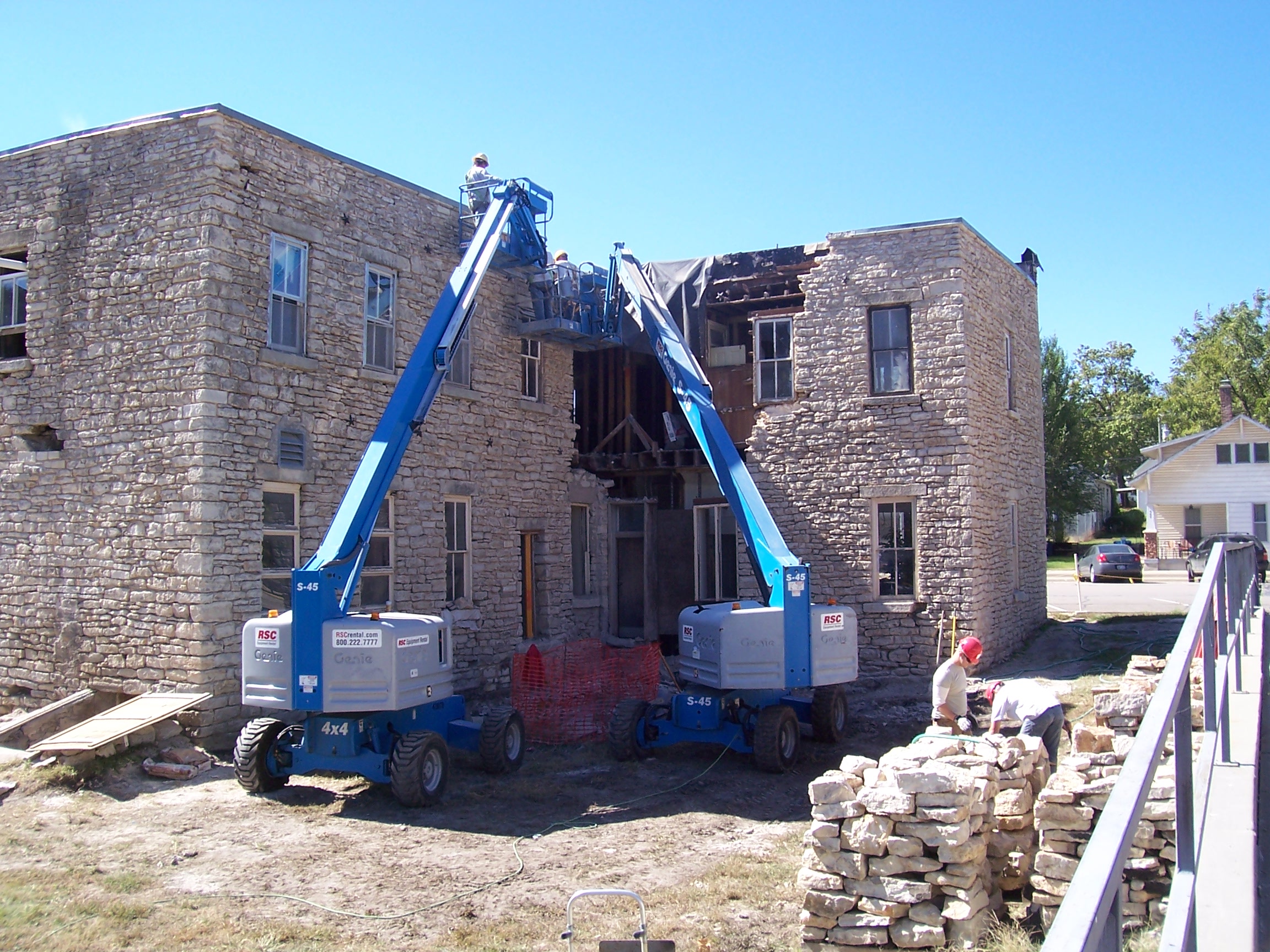 Stonemasons removed, marked and stacked, and then re-laid the original limestone of the Alma Hotel in this view dated 2010.