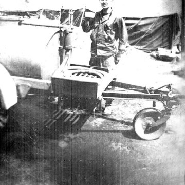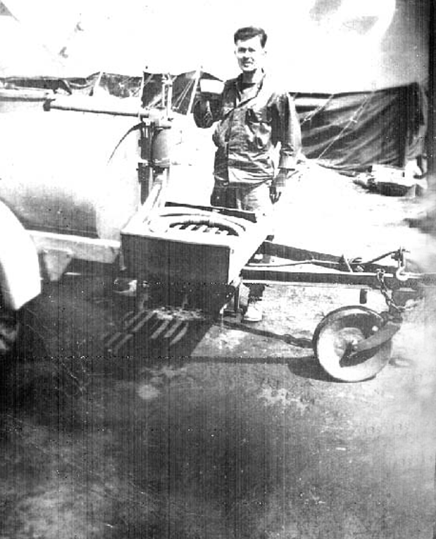 PFC Carl Hoots pauses for a drink of water at an Army water tank. Medical Corps tents are visible in the background.