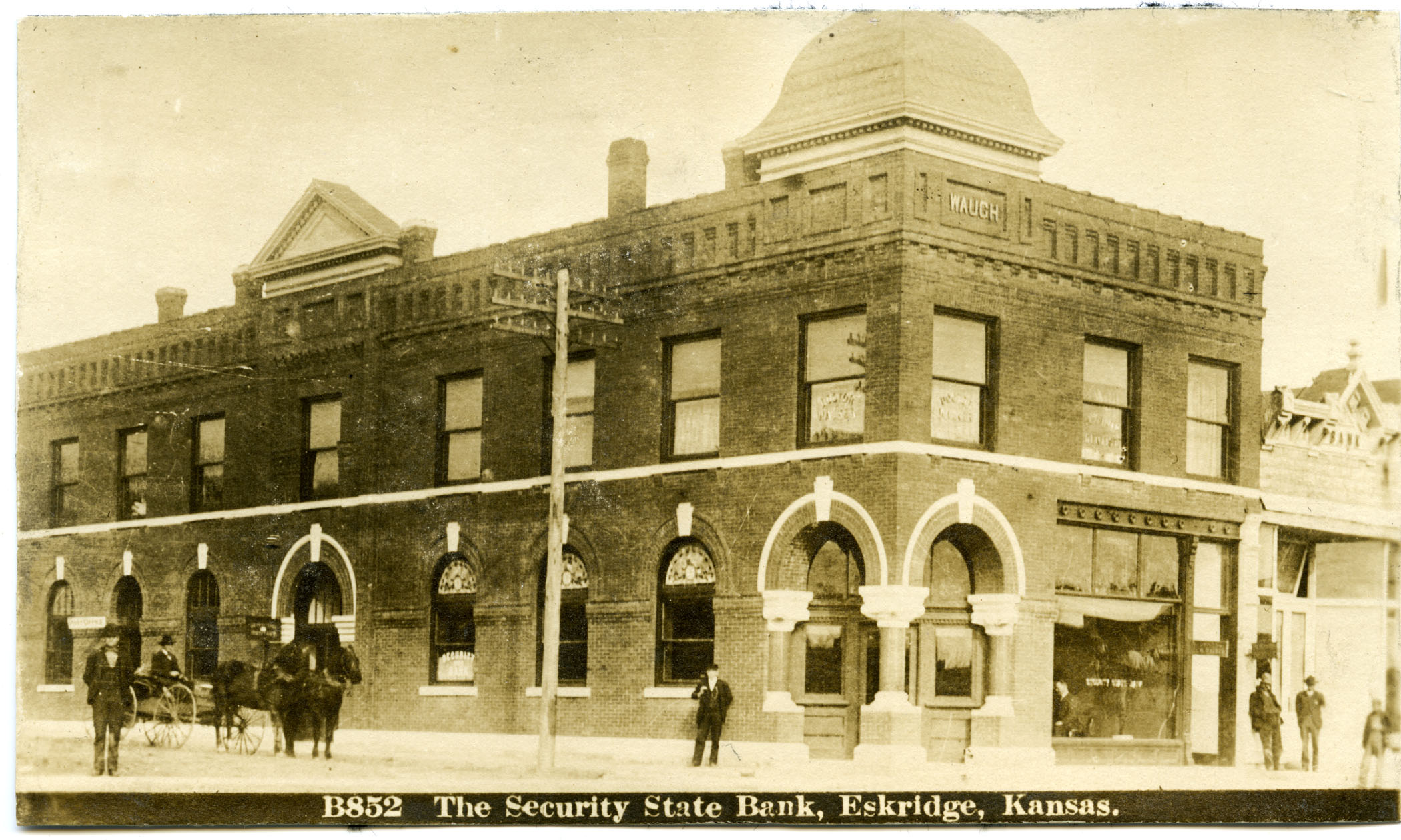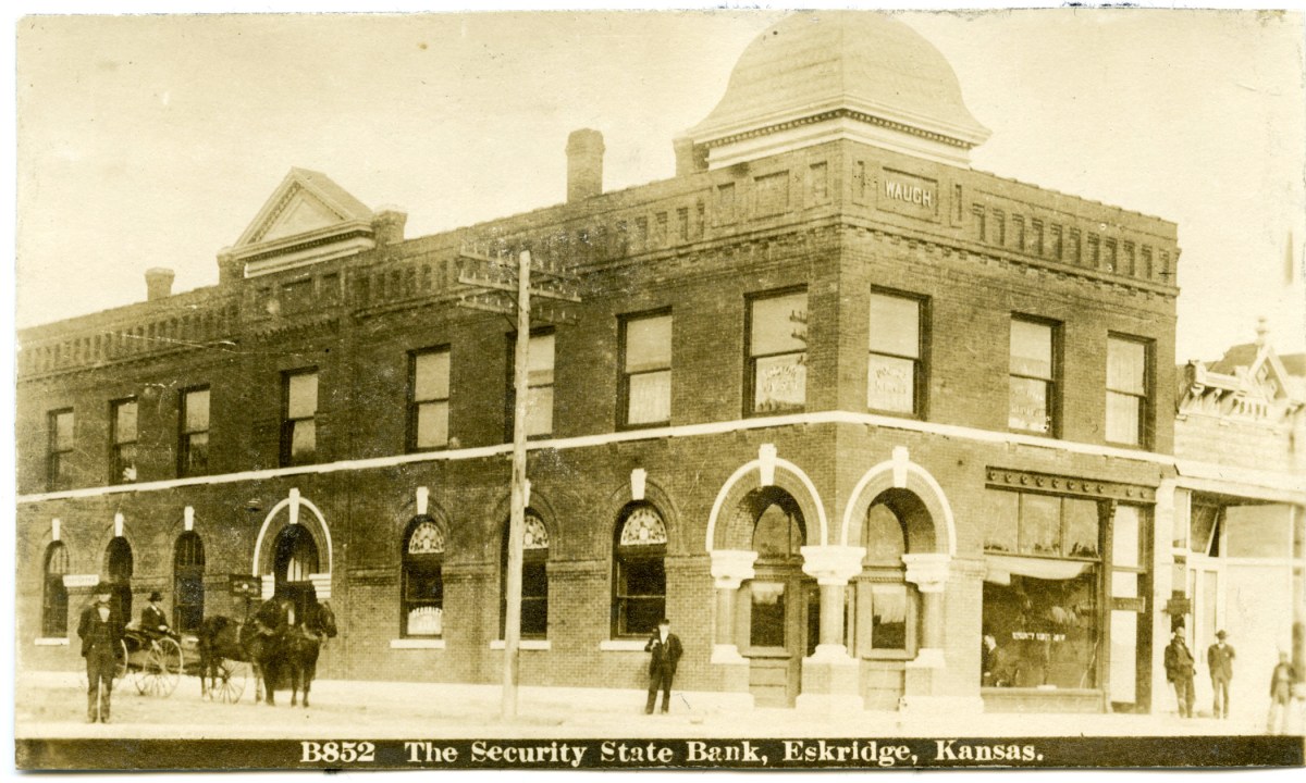 This real photo postcard showing the Security State Bank in Eskridge, Kansas dates from about 1907.